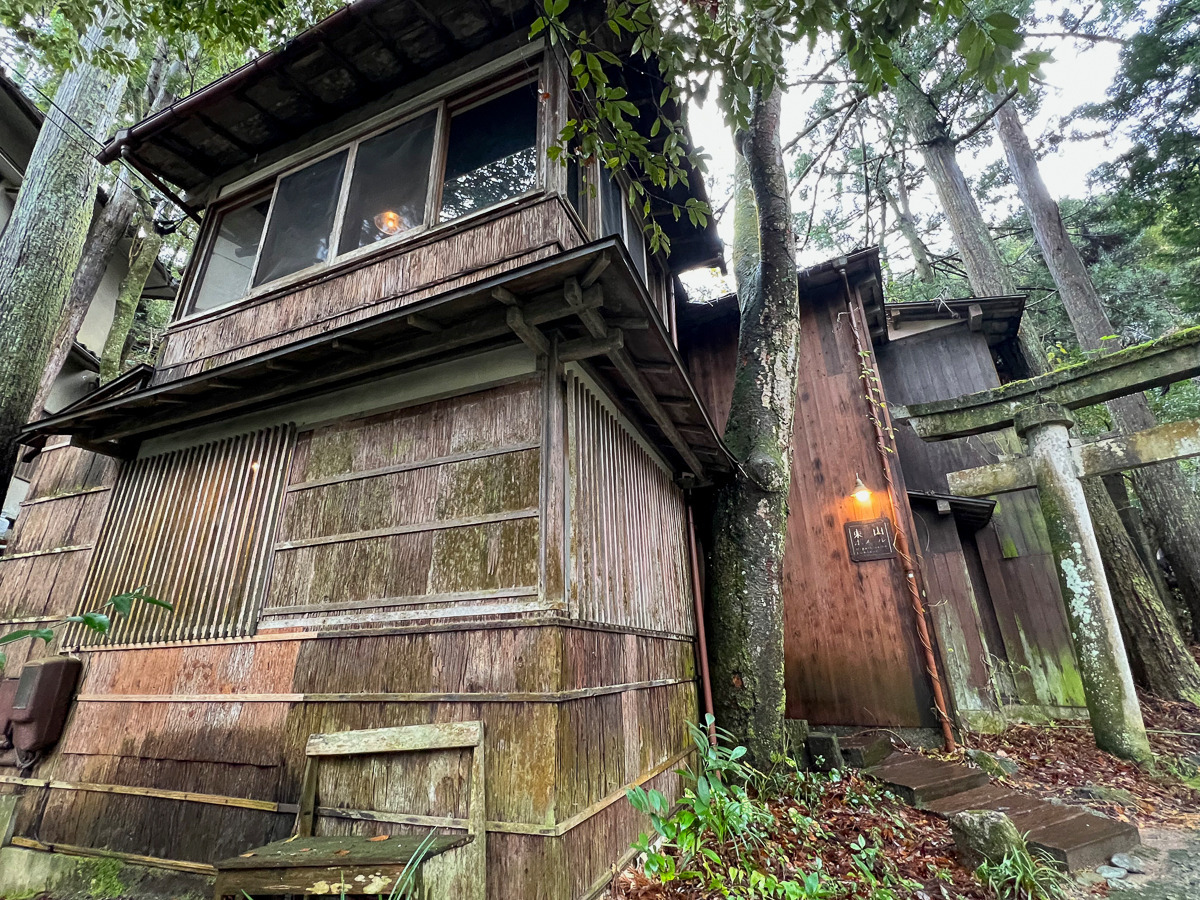 山中温泉にある「東山ボヌール」は、鬱蒼とした森の中にひっそりと佇む隠れ家のようなカフェです。絶景スポット「鶴仙渓」の入口に位置しており、渓谷散策の途中で立ち寄るのにもぴったり。漆器の神様を祀る東山神社の参道沿いにあり、鳥居がすぐそばに立つその景観は、まるで異世界に迷い込んだような雰囲気を感じさせます。