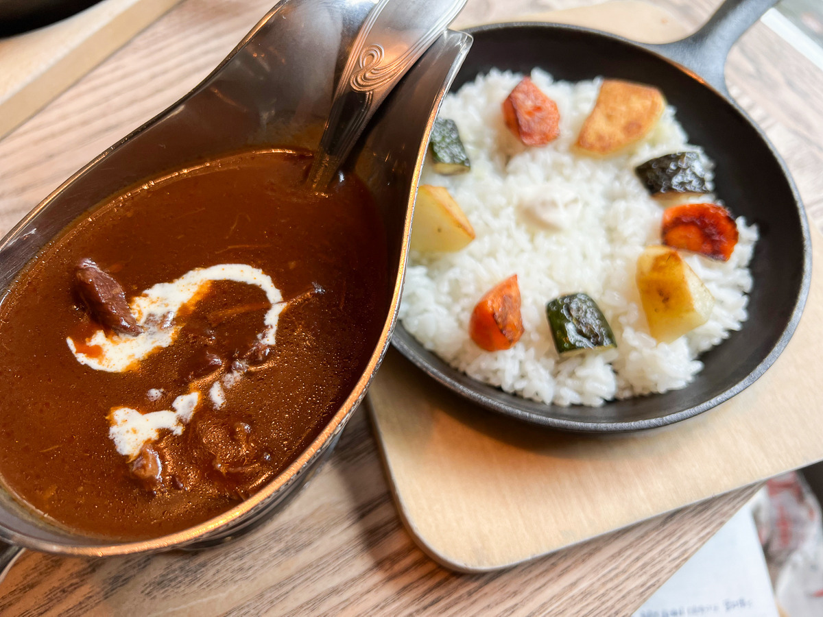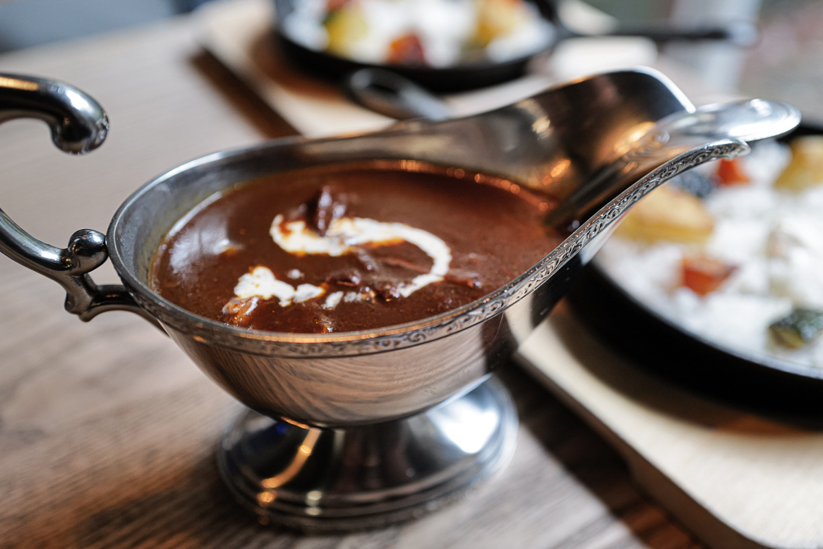 「東山ボヌール」といえば、ランチで提供されている人気メニュー「ビーフシチューライス」。熱々のスキレットに盛り付けたごはんにシチューをかけると、香ばしい音とともに立ち上る湯気が食欲をそそります。
