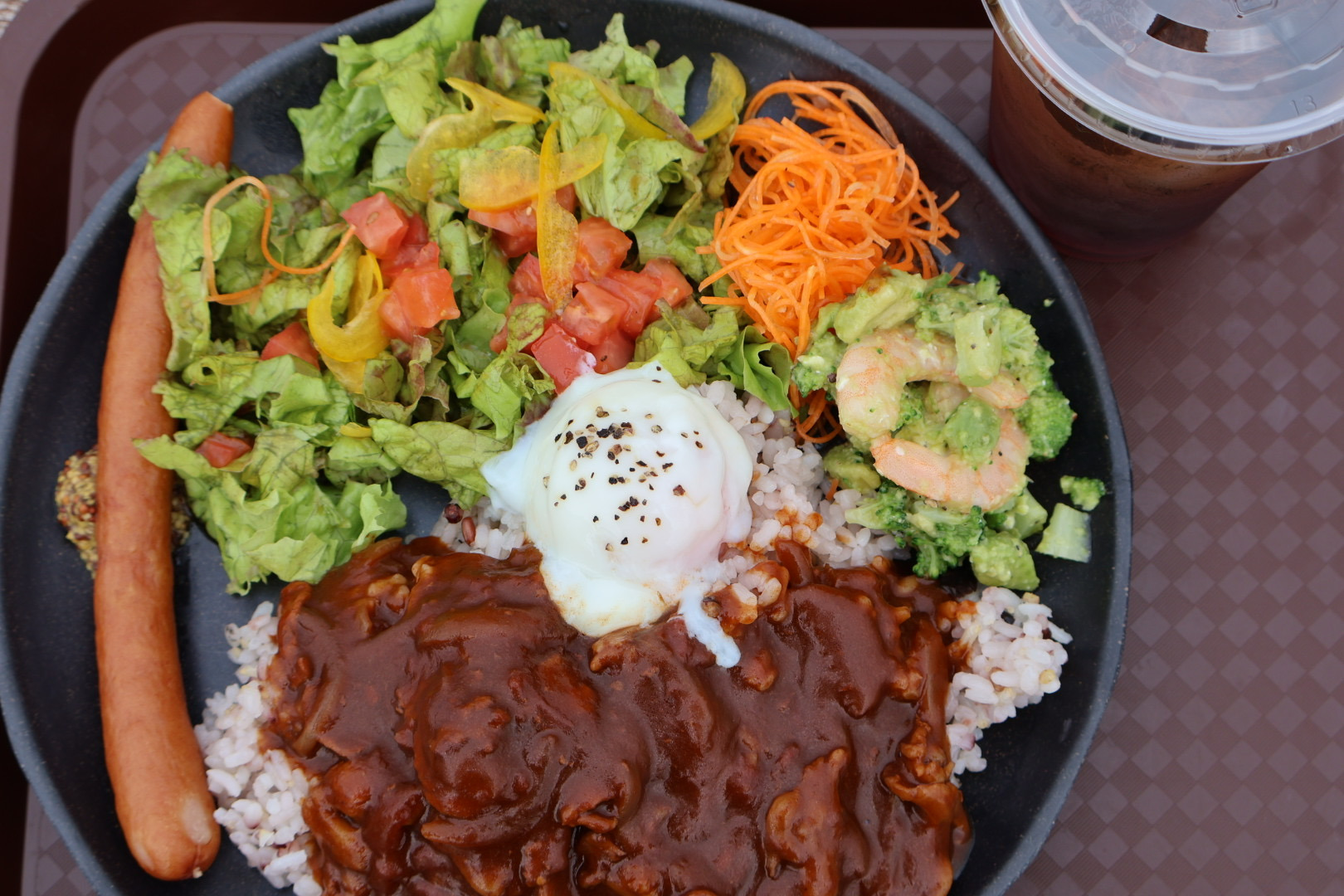 平日限定のプレートランチ「ハッシュドポークプレート」(ドリンクはアイスコーヒー)を注文しました。土日祝にも提供されているライスボールメニューのハッシュドポークに、サラダとドリンクがセットになったお得なランチです。