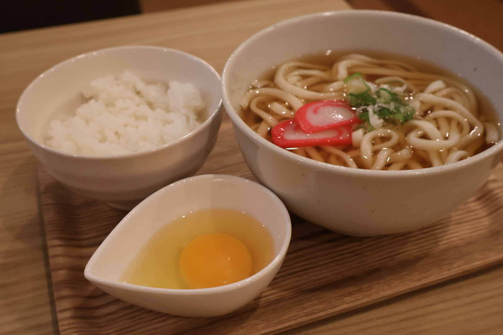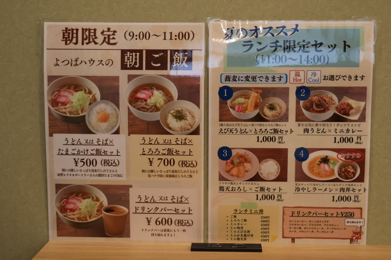 おすすめは、朝限定メニュー「よつばハウスの朝ごはん」。ワンコインで温かい朝食をいただける人気メニューです。この日は、温かいうどんとたまごかけご飯のセット(500円)を注文しました。駅弁よりも手頃な価格で、出来立ての食事を楽しめるのはとても嬉しいポイントです。
