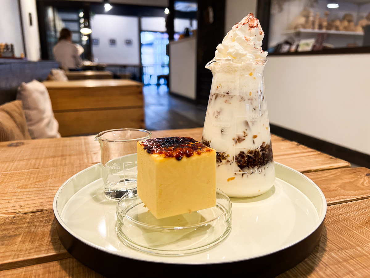 看板メニューの「ブリュレチーズケーキ」は、プレーンをチョイス。キューブ状のケーキがシャーレの上にのせられて提供され、表面は香ばしくほろ苦いブリュレ仕立て。なめらかで濃厚なチーズの風味が引き立ちます。チーズケーキ好きのオーナーが試行錯誤を重ね、レアでもベイクドでもない絶妙な食感に仕上げたこだわりの一品です。プレーンのほか、ミルクティー・抹茶・ローストナッツ・黒ごま・マロンなど、さまざまなフレーバーが楽しめます。さらに「とろ生チーズケーキ」シリーズも3種類あり、スイーツ好きにはたまらないラインナップです。