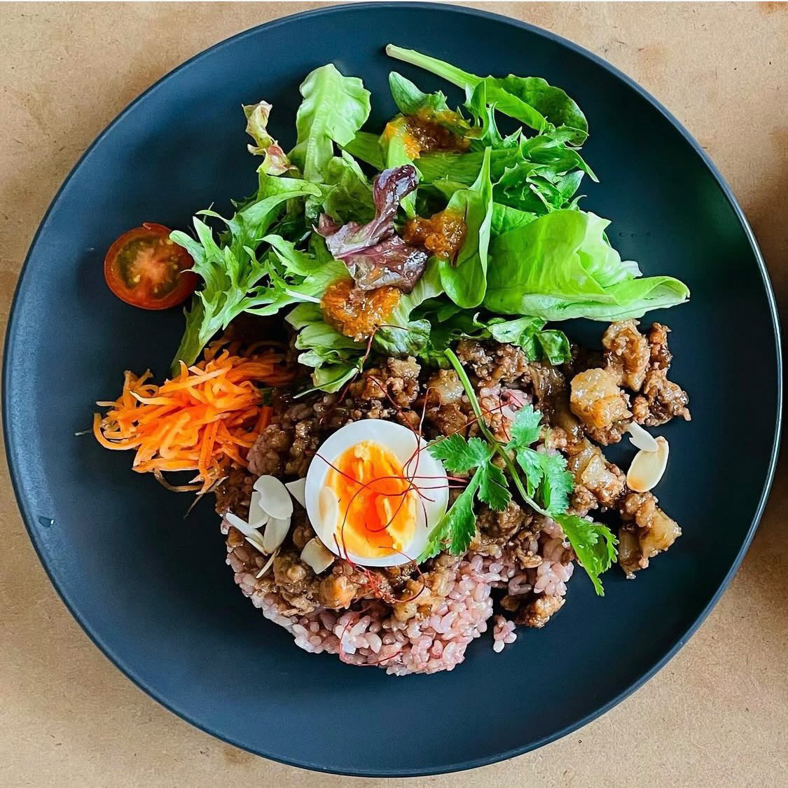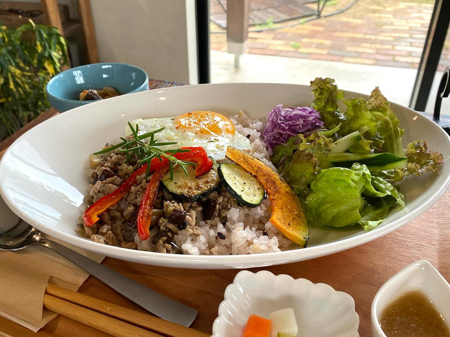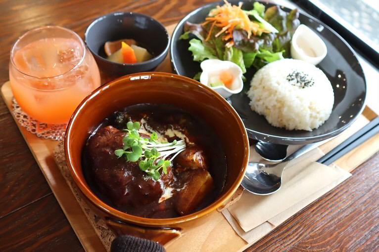 「喫茶hibini(ひびに)」は、ゆったりと過ごせる落ち着いた雰囲気のカフェです。こちらを訪れたらぜひいただきたいのが、カレーや台湾ルーローハン、カオマンガイなど、丁寧に仕込まれたエスニック料理。