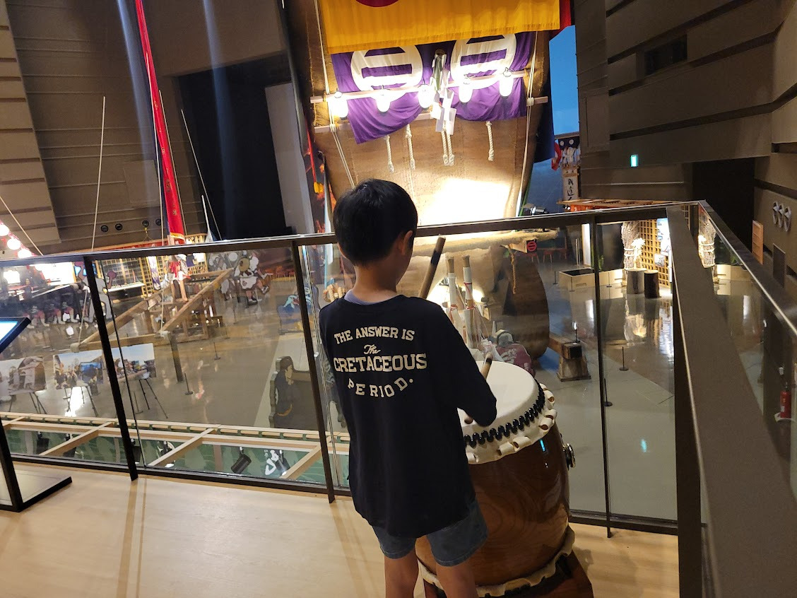 会館では、実際に太鼓を叩いて、その振動と鼓動を全身で感じることができます。子どもから大人まで、誰でも気軽にお祭り気分を楽しめる人気のコーナーです。