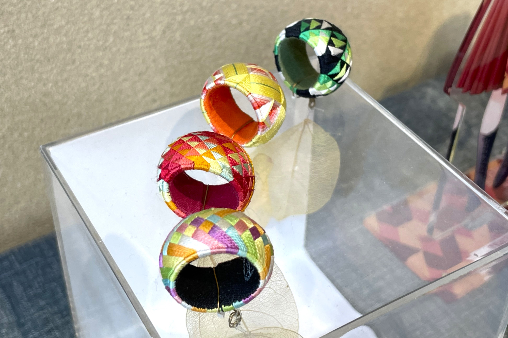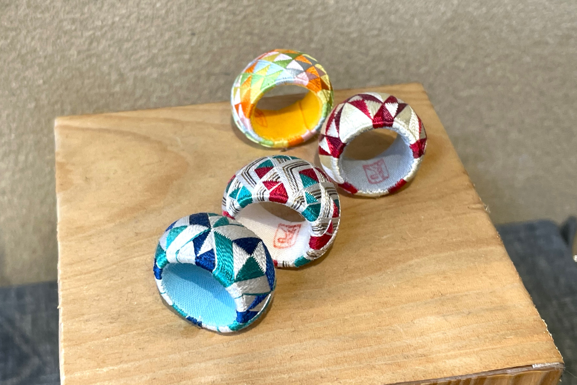 「加賀てまり 毬屋」にやってきました。こちらは手作業で作る工芸品「加賀てまり」と「加賀ゆびぬき」の専門店。どちらも光沢ある絹糸で色鮮やかにデザインされていて、その美しさに見とれてしまいます♡ストラップやアクセサリーとして販売されているものもあり、金沢土産として人気なんだそう!