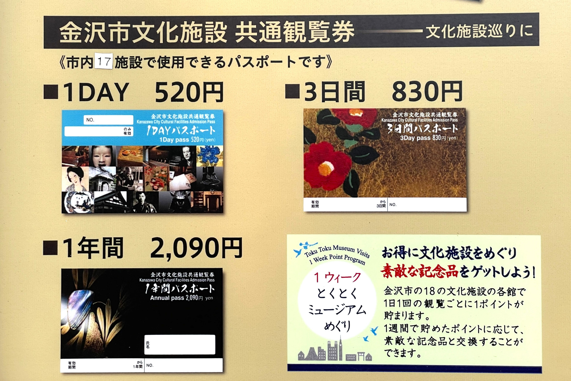 ■ここでポイント情報!今回のスタンプラリースポットの「金沢文芸館」「金沢市立安江金箔工芸館」「金沢くらしの博物館」の展示室の共通入場券「金沢市文化施設共通観覧券」が各施設の窓口で販売されています。また「石川県立歴史博物館」もこの共通観覧券で団体料金で観覧できますよ。