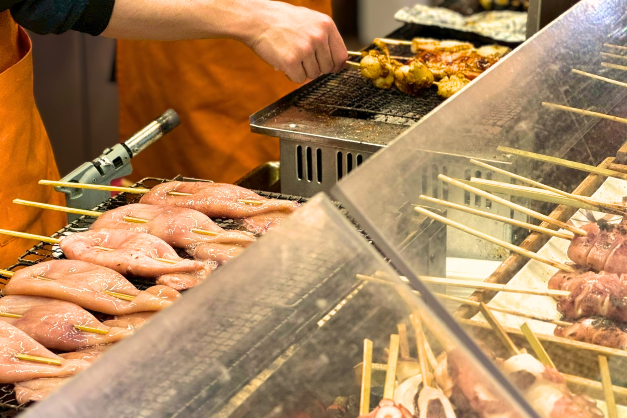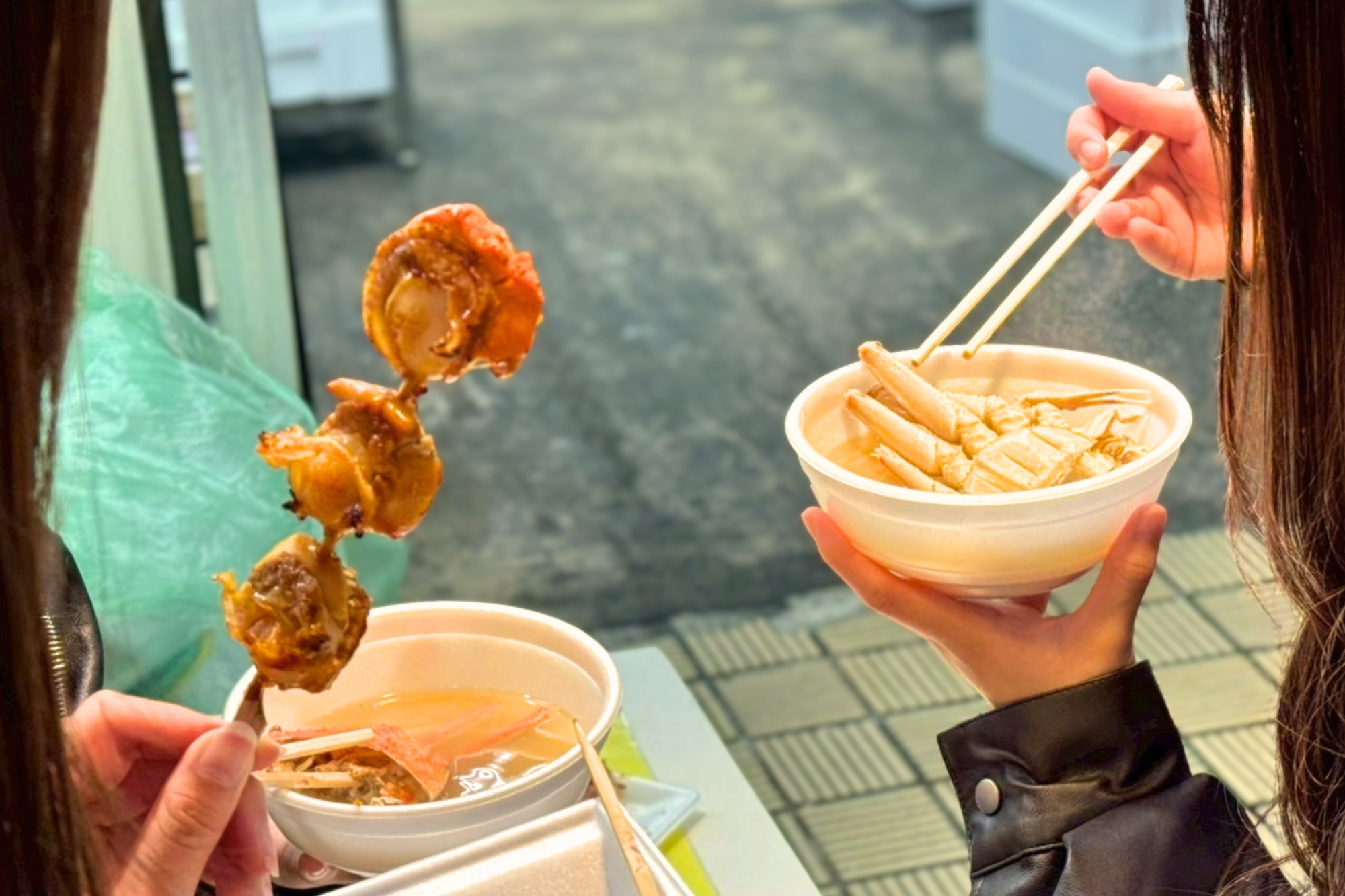 ここでは、イカやホタテの串焼きがその場で!アツアツで!楽しめます。目の前で焼いているのも魅力的なところ。さらにカニが美味しい季節には、あたたかいカニ汁も楽しめます。海鮮の焼ける香りが漂うこのお店に立ち寄らない理由はありません!
