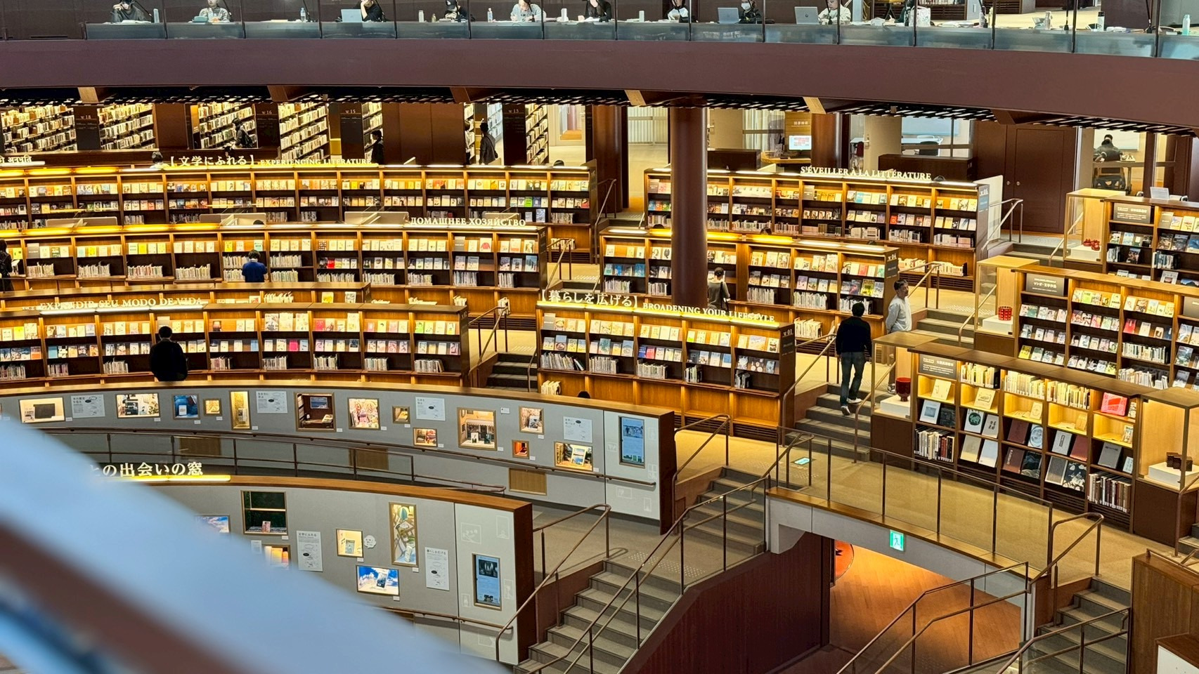 ここには図書館の端と端をつなぐ”ブリッジ”があります。このブリッジからは図書館全体を見下ろすことができ、その景色は息をのむほど綺麗です。ついついシャッターを切ってしまいますね。
