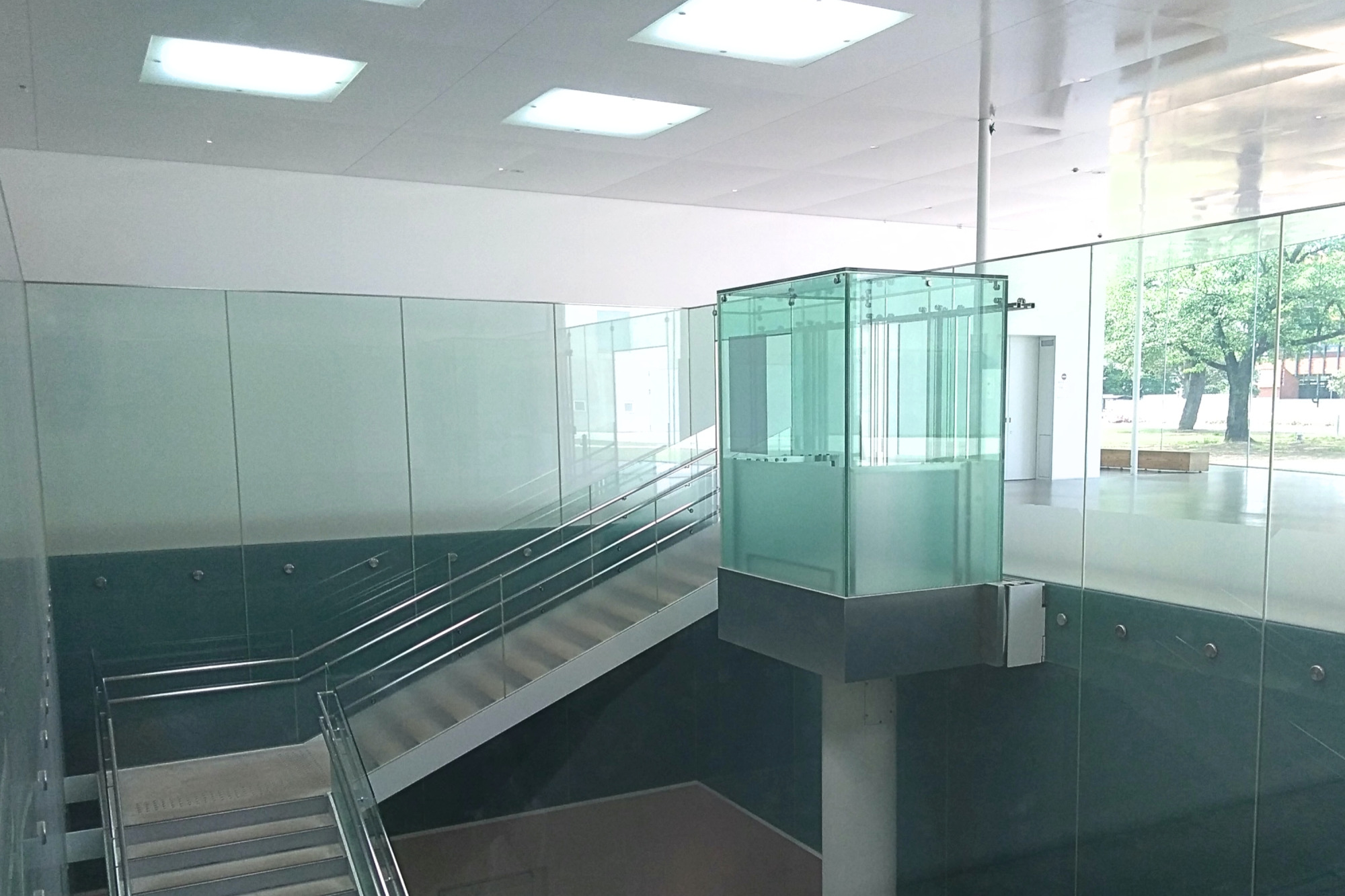 透明のガラスの箱が、吹き抜けになった空間を上下する「油圧式エレベーター」。ガラス張りの開放的な空間デザインにマッチしていて、まるで芸術作品のよう…と驚く方もいるのだとか。