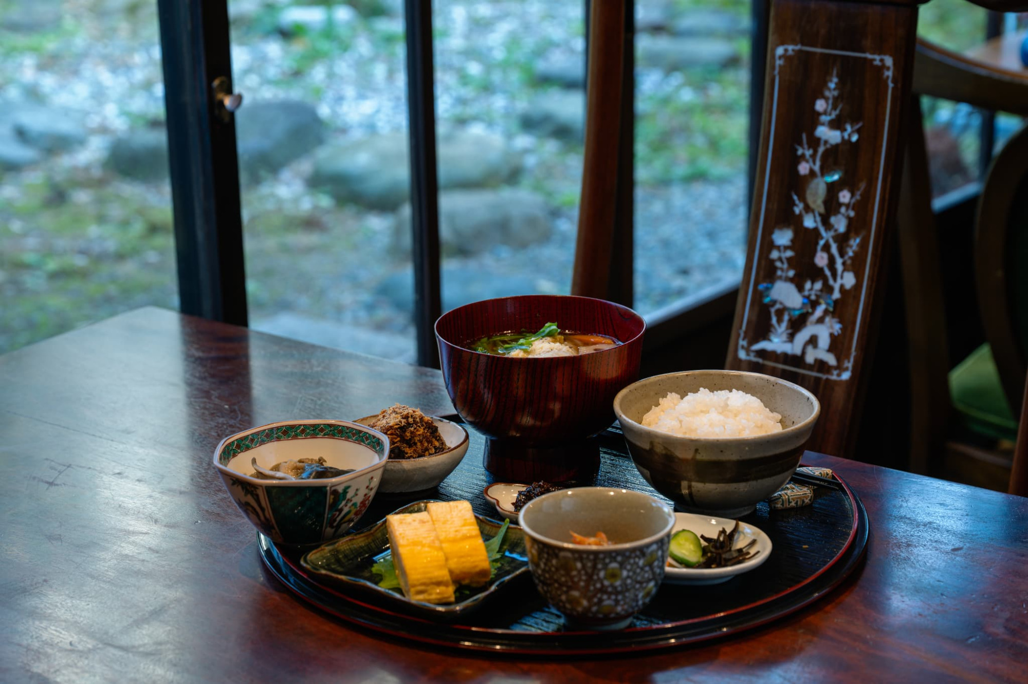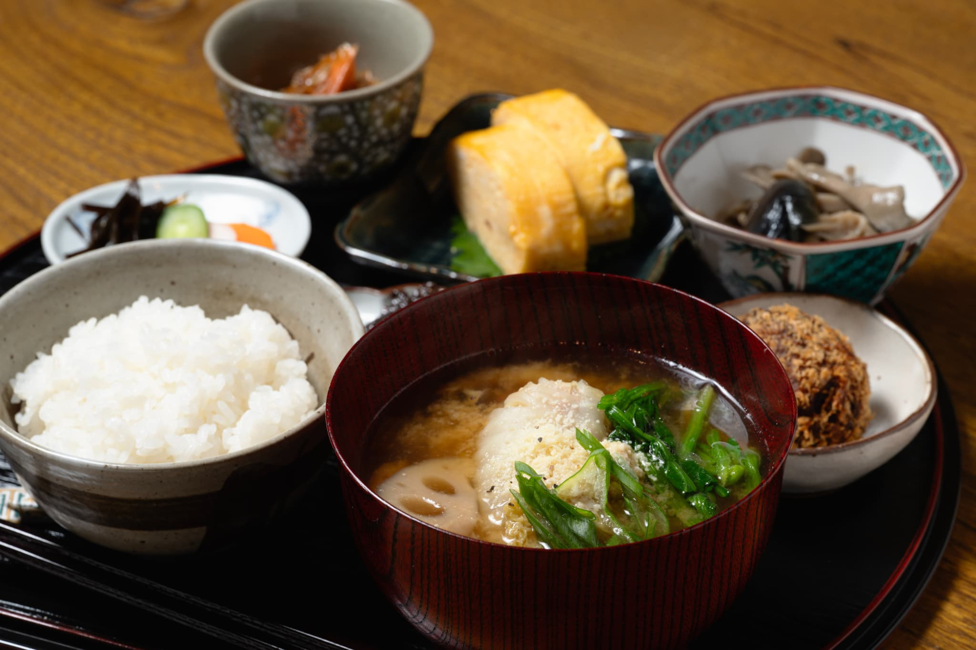 ひがし茶屋街の奥に佇む、金沢町家を改装した静かな空間でいただけるのは、お味噌汁が主役の日本の家庭料理。