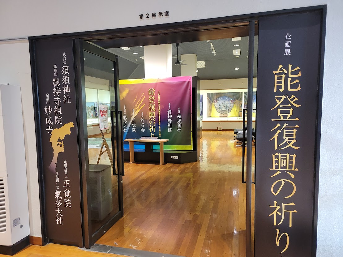 羽咋市歴史民俗資料館では、企画展「能登復興の祈り」を開催中。この企画は、奥能登・口能登の垣根を越え、5つの神社仏閣が協力し合うことで実現しました。普段はそれぞれの地で大切に守られている至宝が、復興への願いとともに一堂に集います。氣多大社・妙成寺・正覚院(羽咋)、總持寺祖院(輪島)、須須神社(珠洲)の5社寺が手を取り合い、集った至宝は圧巻です。