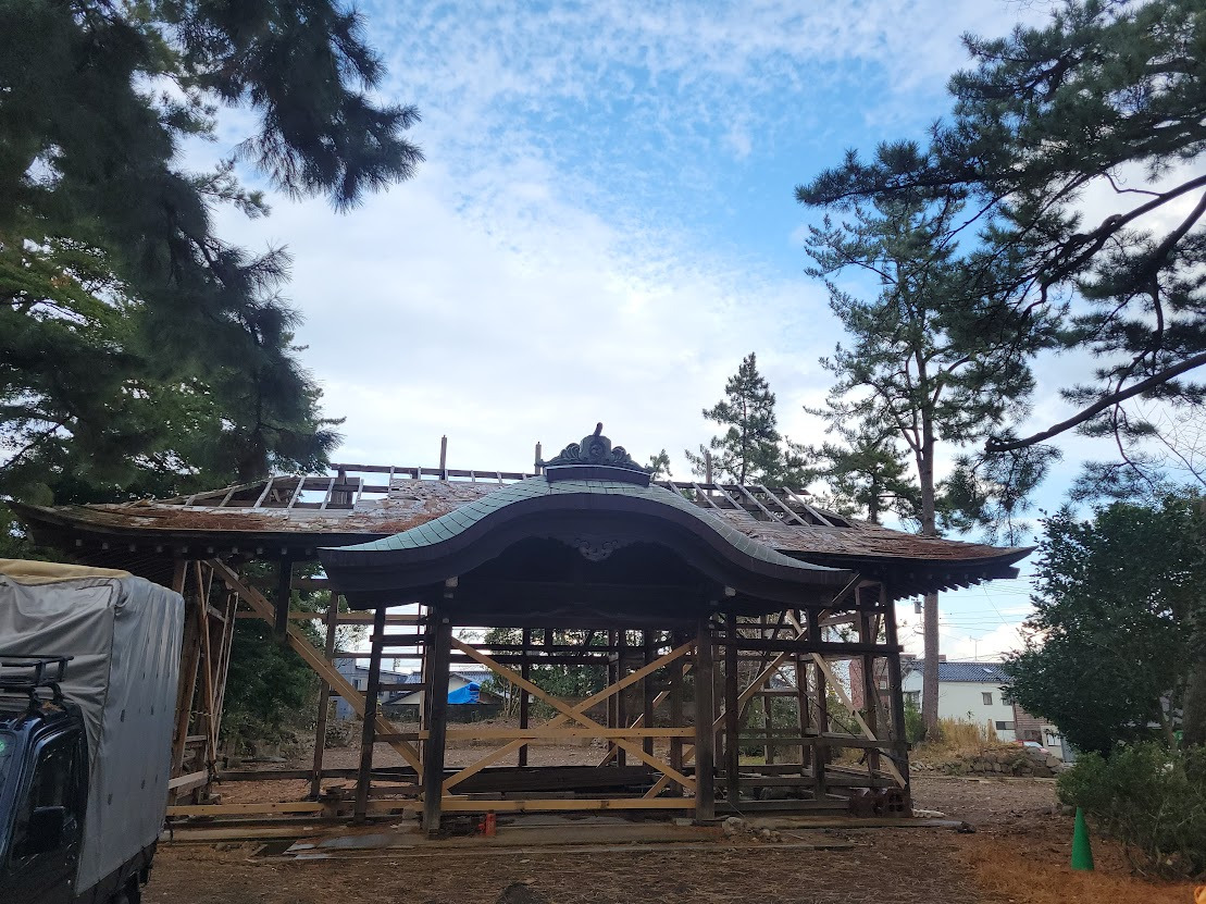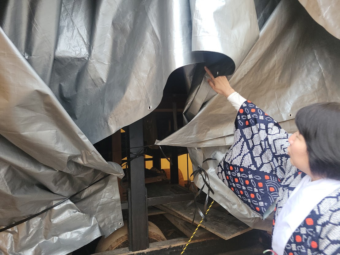 現在、神社の社務所は解体され、拝殿にもねじれが生じるなどの大きな被害が残っています。見学プランでは、テント内に仮安置された市指定文化財「曳山(ひきやま)」を拝見できます。修繕中に被災し、半年間も野ざらしを余儀なくされた曳山は、復興への苦難のシンボル。紫外線や埃によるダメージは大きいものの、いつか再び輝きを取り戻す日を待っています。ありのままの姿を見学することで、文化を守り抜くことの難しさと尊さに気づかされます。