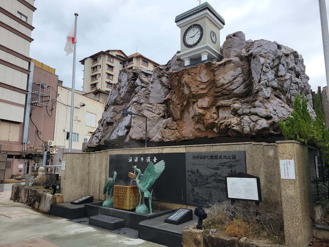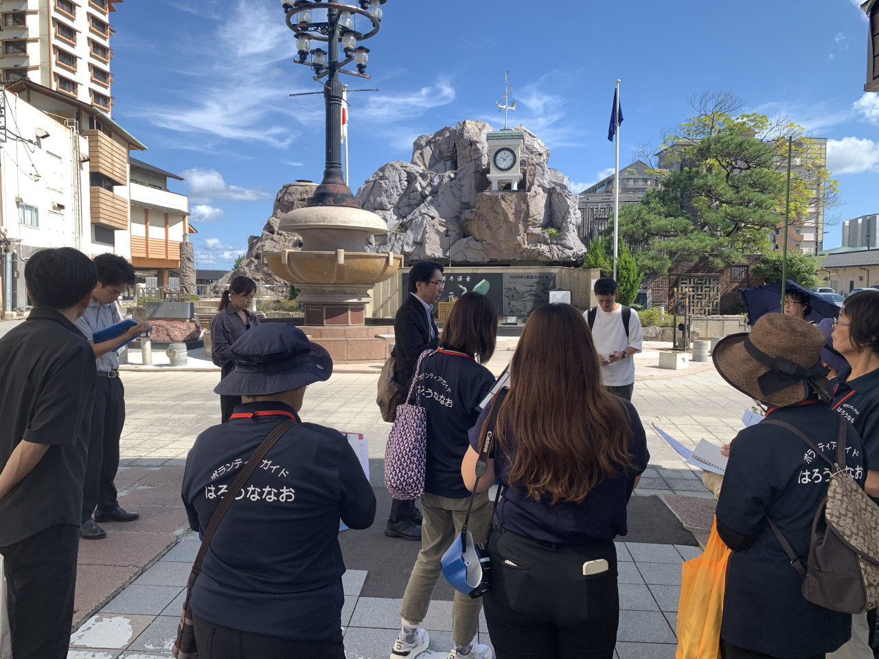 ツアーのスタートは、和倉温泉のシンボル「湯元の広場」です。ボランティアガイド団体「はろうななお」のガイドさんが、和倉温泉の成り立ちや「和倉」という名の由来を、優しく教えてくれます。
