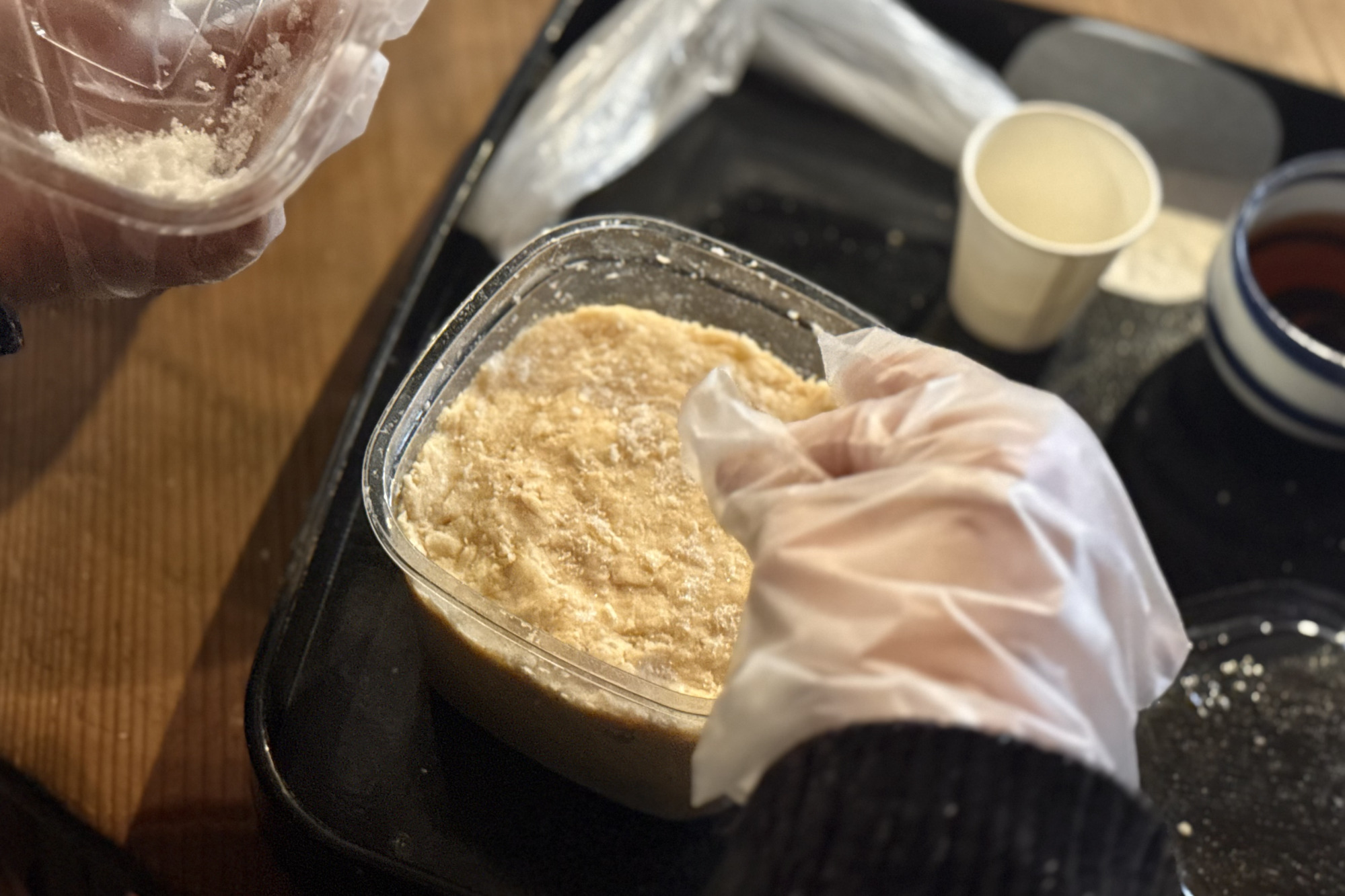 いくつか工程がある中で、特に印象に残ったのが「塩」を使う工程です。味噌づくりにおいて塩はとても重要な役割を果たします。味噌は麹の働きによって発酵してできる食品ですが、そこで活躍するのが塩。塩には雑菌の繁殖を抑える働きがあり、味噌づくりには欠かせない存在なのだそうです。女将さんもこのことを何度も教えてくださり、お味噌における塩の大切さを学ぶことができました。