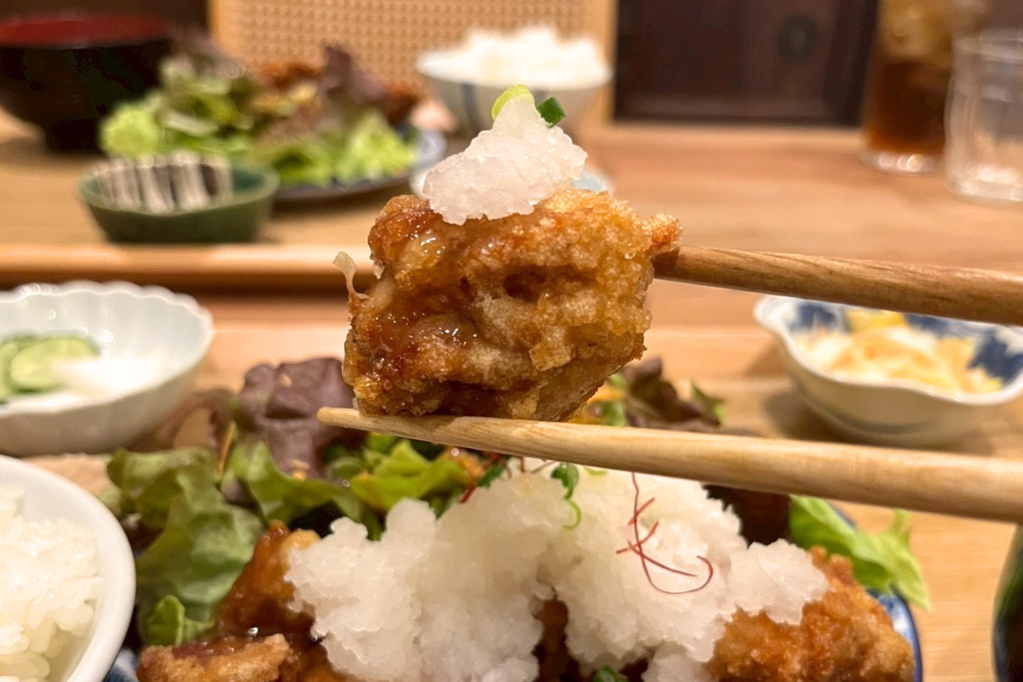 メニューはどれも魅力的で迷いましたが、今回は「鬼おろしみぞれ唐揚げ定食」を注文。ランチには自家製の糠漬けがついてきます。毎日丁寧に作られているそうで、やさしい味わいがとても印象的でした。