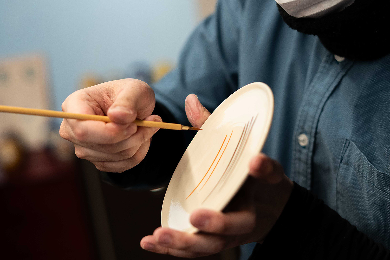 ガイドの案内で館内とギャラリーを巡った後は、名匠・前端雅峯一門の職人から直接教わる「本漆絵付け体験」を。丸盆のほか、お好みで汁椀や棗(なつめ)への変更も可能です。