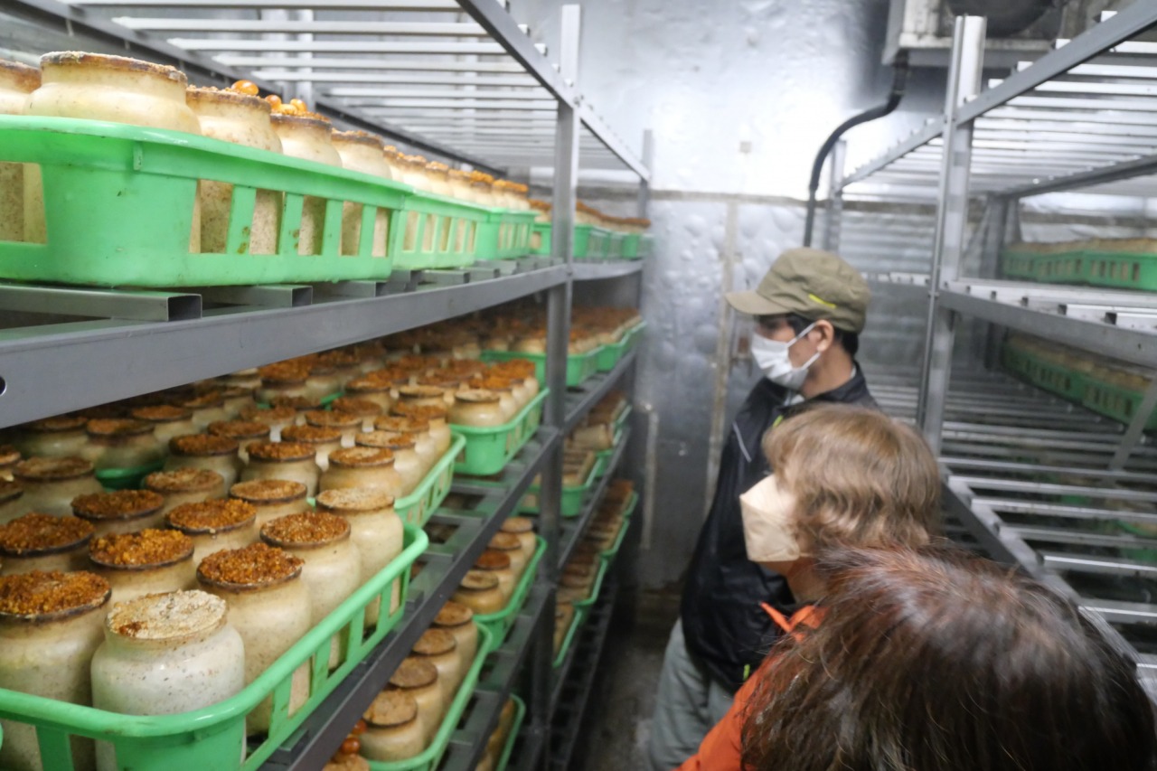 いよいよ出荷状態のなめこを収穫します。担当者の方が収穫する部屋までなめこを運び、手袋などをして収穫していきます。小さいなめこは容器となめこ全体をねじるようにすれば取れますが、大きななめこは、ハサミを使ってひとつずつ収穫していきます。