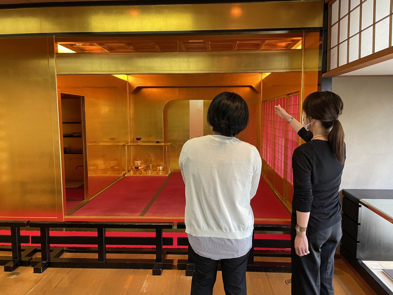 壁や天井はもちろん、茶道具や細かな部分まですべて金箔が張られ、その輝きに圧倒されます。