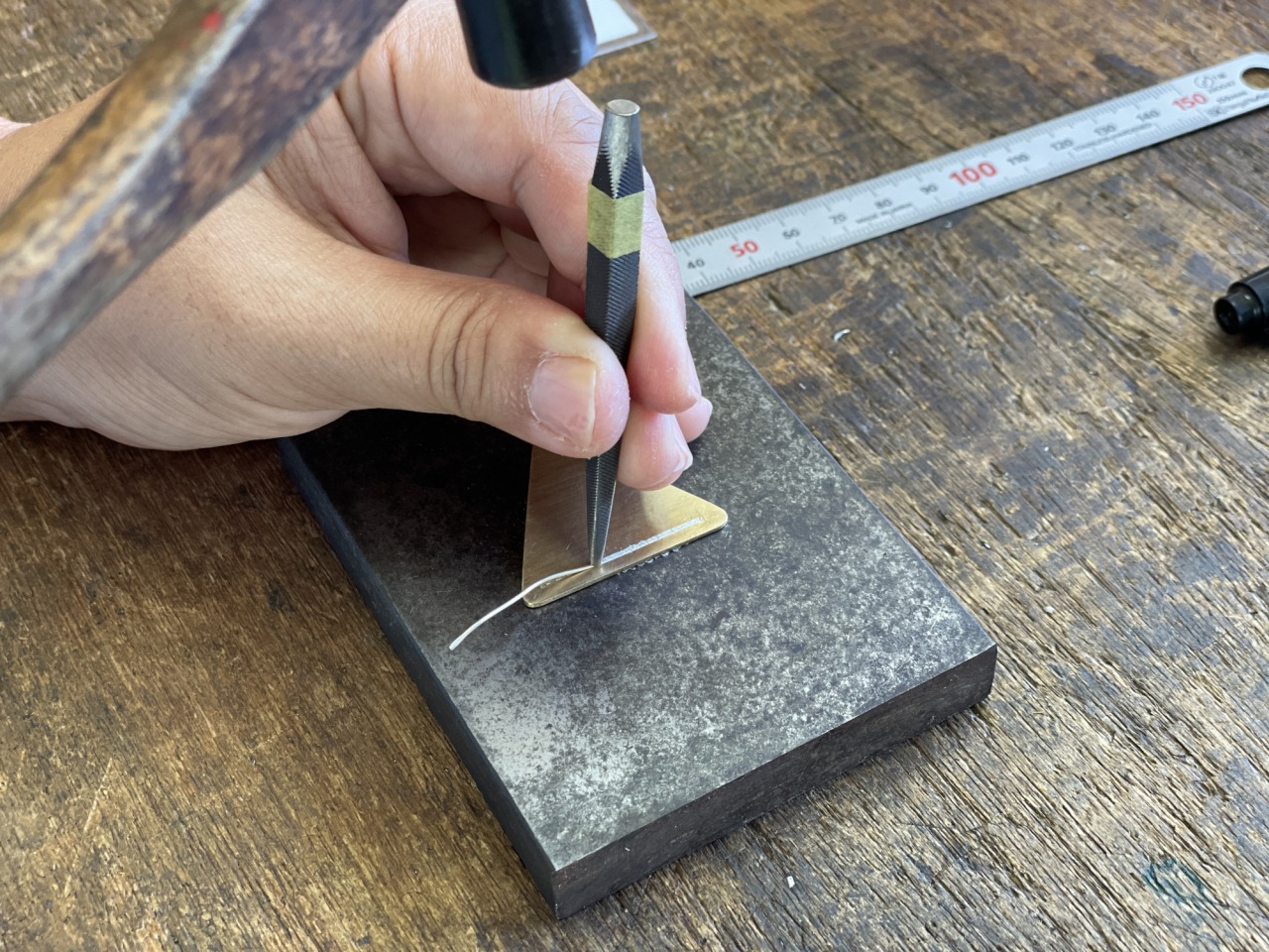 最初は象嵌の作業から。真鍮板に彫ってある溝に純銀の細い線を打ち込んでいきます。