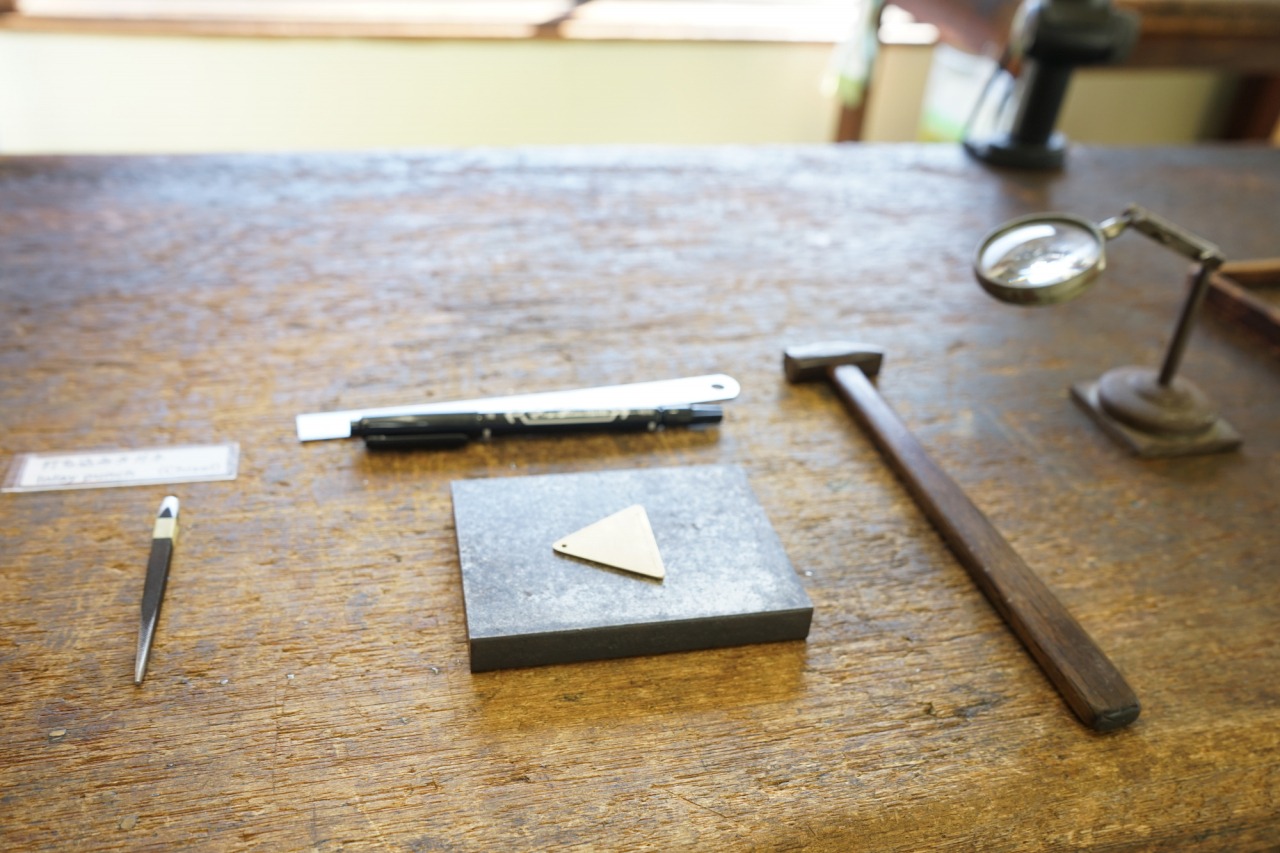 約80年の歴史を持つこの金属彫刻所。昔は手彫りや機械彫刻で金型に模様を彫刻し、記念メダルやシールなどを作成していました。体験スペースは代々伝わる作業机や道具に囲まれ、歴史を感じる空間です。