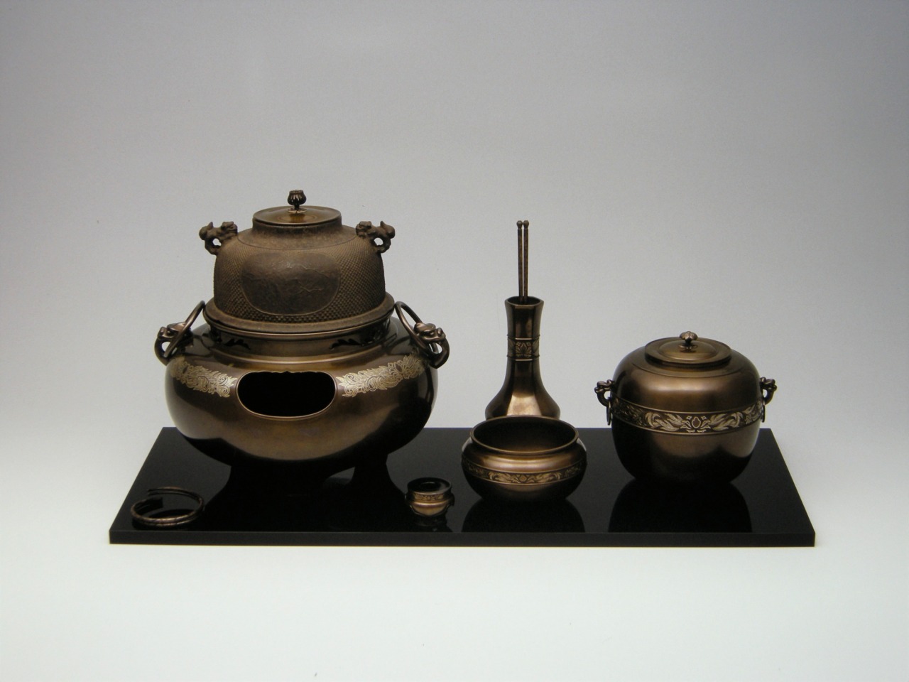 ※上記2点の写真は中村記念美術館より提供。(上:十二代 宮﨑寒雉「牡丹唐草文象嵌唐銅皆具」昭和24年作、下:初代 山川孝次「小槌熨斗押」明治時代作)。