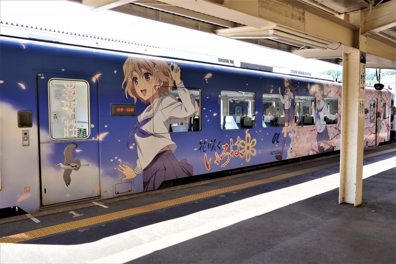 のと鉄道では時期によりラッピング列車が運行されていて、現在は、作中にのと鉄道も登場したアニメ『花咲くいろは』のキャラクターが描かれている「花咲くいろは4号」が走っています。のと鉄道終点の穴水駅では車両が待機していることが多く、シャッターチャンス。