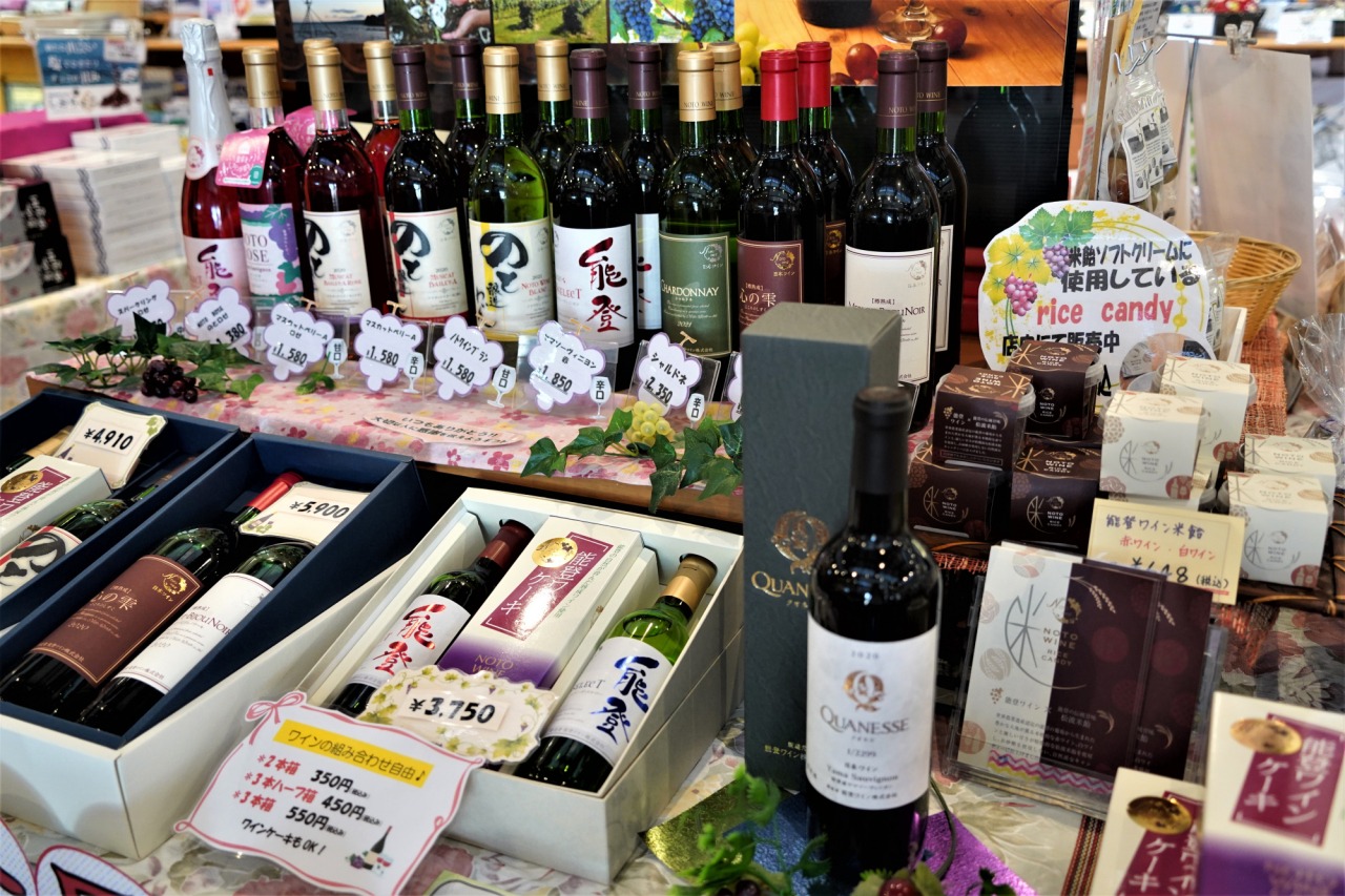 数ある商品のなかでも、「能登ワイン」が一際目を引きます。穴水の広大な畑で栽培されたワイン専用のブドウで醸造する本格的な日本ワインです。全国にファンも多く、ワイン好きにはぜひおすすめ。