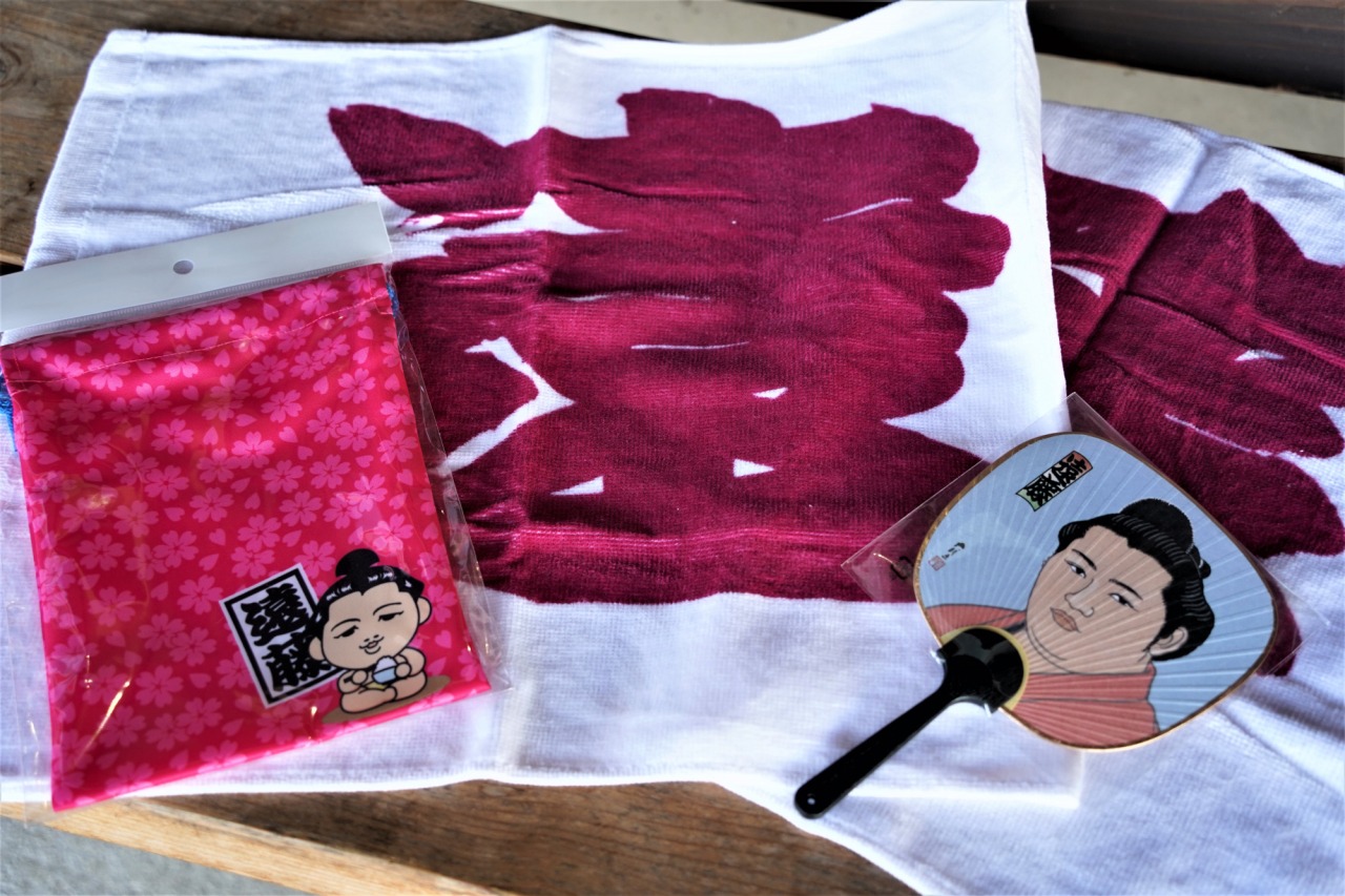 「四季彩々のイチオシは相撲界の遠藤関グッズです」とスタッフ。甘いマスクと技巧相撲が女性に人気の遠藤関はここ穴水町出身。応援グッズコーナーでは、スタッフが人気の3品を選んでくれました。左が遠藤関のかわいいイラスト入りの巾着(600円)、真ん中が力士応援タオル(750円)、右がイケメンイラストの豆うちわ(460円)です。