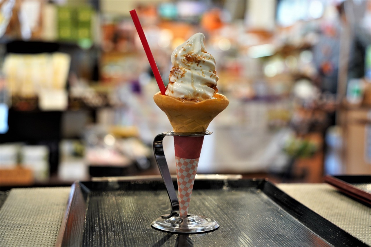 四季彩々には、評判のご当地ソフトクリームがあります。その名も「能登ワイン米あめソフトクリーム」(400円)です。伝統的な米あめを製造する地元の横井商店と能登ワインのコラボでできたもので、アルコールは入ってないので子どもから大人まで楽しめます。