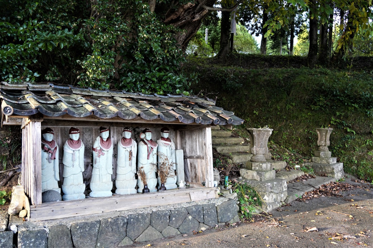 穴水駅から車で約30分、中居湾の海景色を右手に見ながら途中約7kmで右折し山中を走ります。穴水駅から約16kmの地点に『明泉寺』があります。道路上の看板には明千寺と書いてありましたが、明泉寺のある地名が明千寺なのでOK。明泉寺は道路左の山手にあって少し分かりにくいのですが、目印は道路沿いにあるこの六地蔵です。ここを通り過ぎてしまうと1kmほどで富山湾にぶつかります。