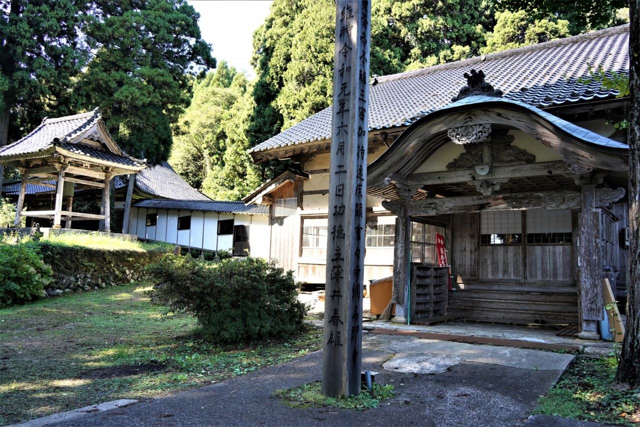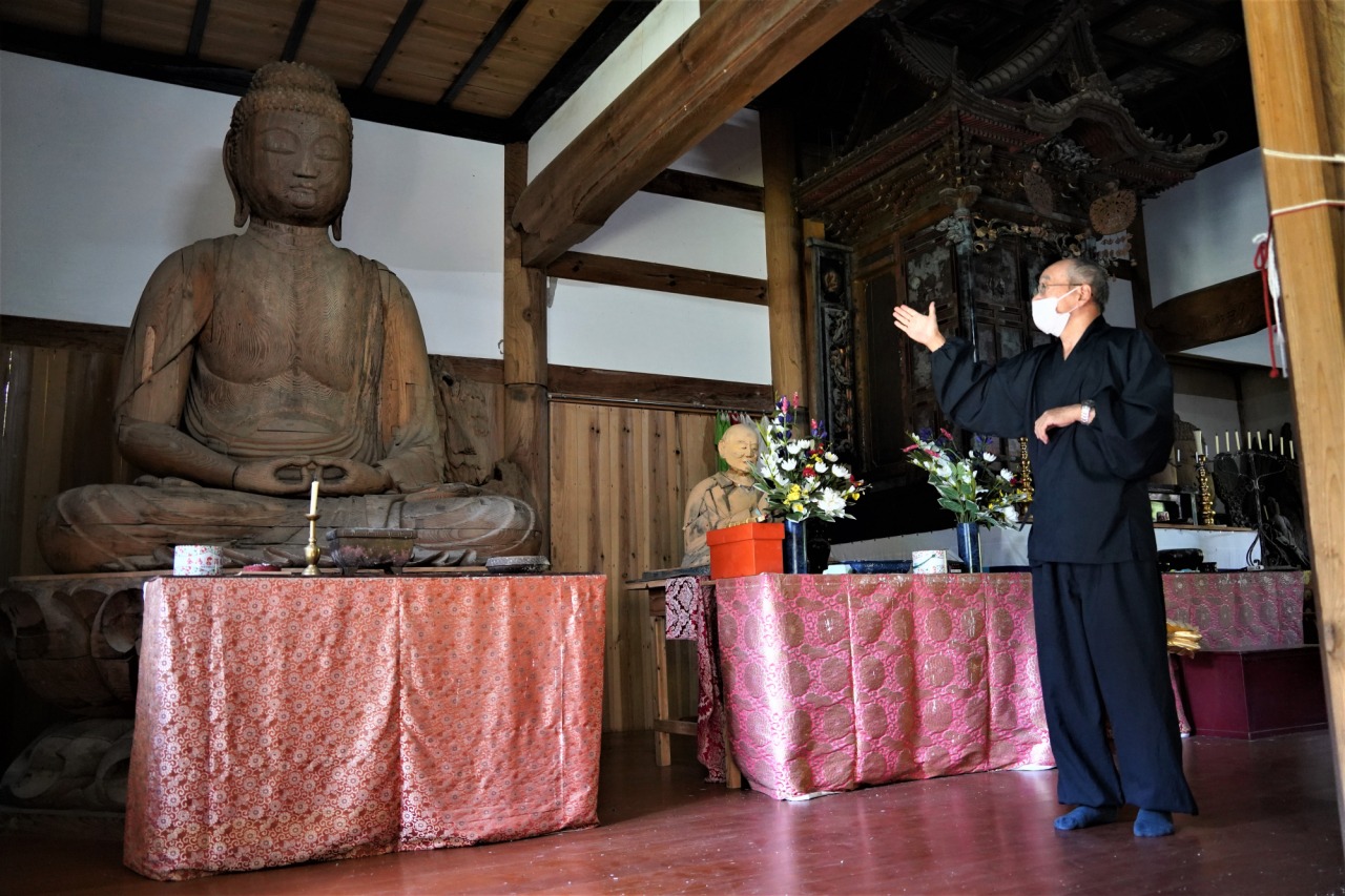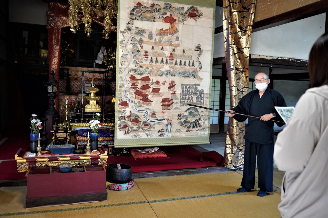 明泉寺の由緒などの説明は、予約をすれば住職が対応してくれるというので、あらかじめ電話で予約をしました。本堂では、寺に受け継がれる紙本着色明泉寺絵図を見ながら、歴史的な背景や、かつての明泉寺は海沿いまで境内が広がっていたこと、境内には石仏や石の水船、石塔など地元の前波石を使った石材文化があること、貴重な木製の仏像も残ることなどを細かく説明してくれました。歴史好きにはとても興味深いことばかりです。
