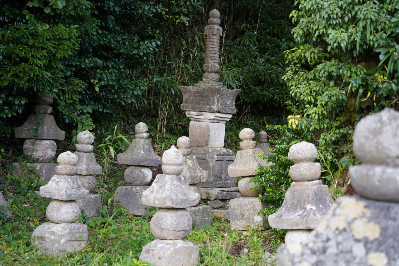 ちょっと不思議なのですが、明泉寺のすぐそばに「源頼朝の墓」といわれる一角がありました。頼朝の墓とみられるひときわ高い宝篋印塔(ほうきょういんとう)を中心に、たくさんの五輪塔が並びます。頼朝は今、テレビドラマでも話題ですが、住職に尋ねると、この地は北条家にゆかりがあることから政子のつながりで墓があるのでは、とのこと。最近は「頼朝の墓に参りたい」との問合せも多いそうです。