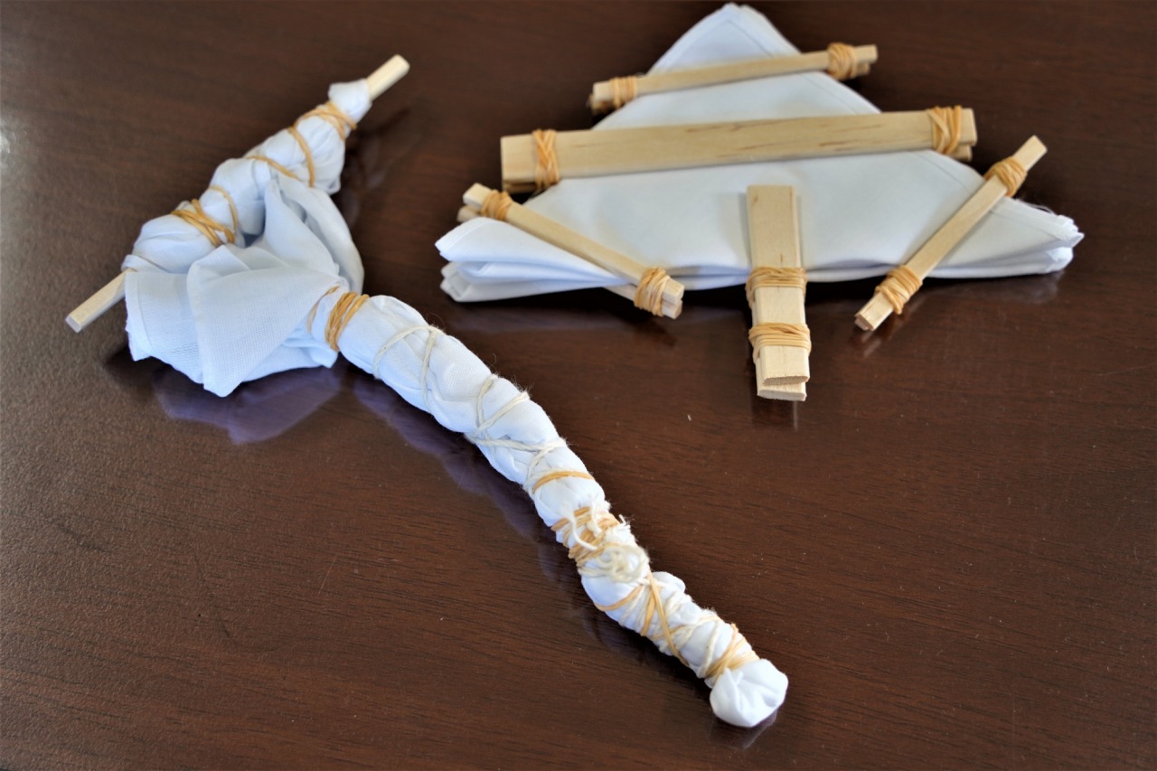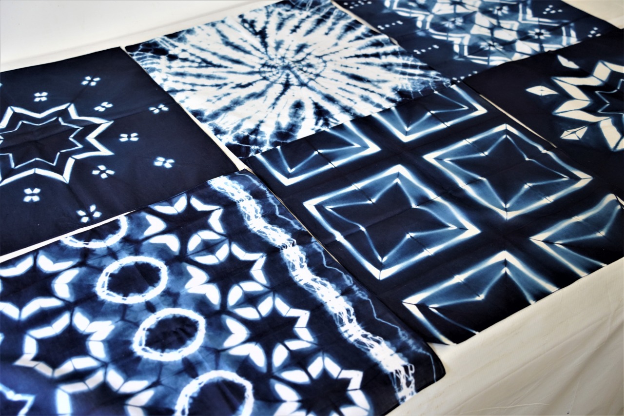 今回選んだのは木綿のハンカチで、方法は、割り箸で止めてつくる幾何学模様です。四角いハンカチをたたんで止めた部分が白く残るのですが、どこがどこだか・・・でも丁寧に止め方や位置を指導していただけるので、とてもスムーズです。止める輪ゴムはかなりきつく巻いた方が白くハッキリ模様が出そうです。