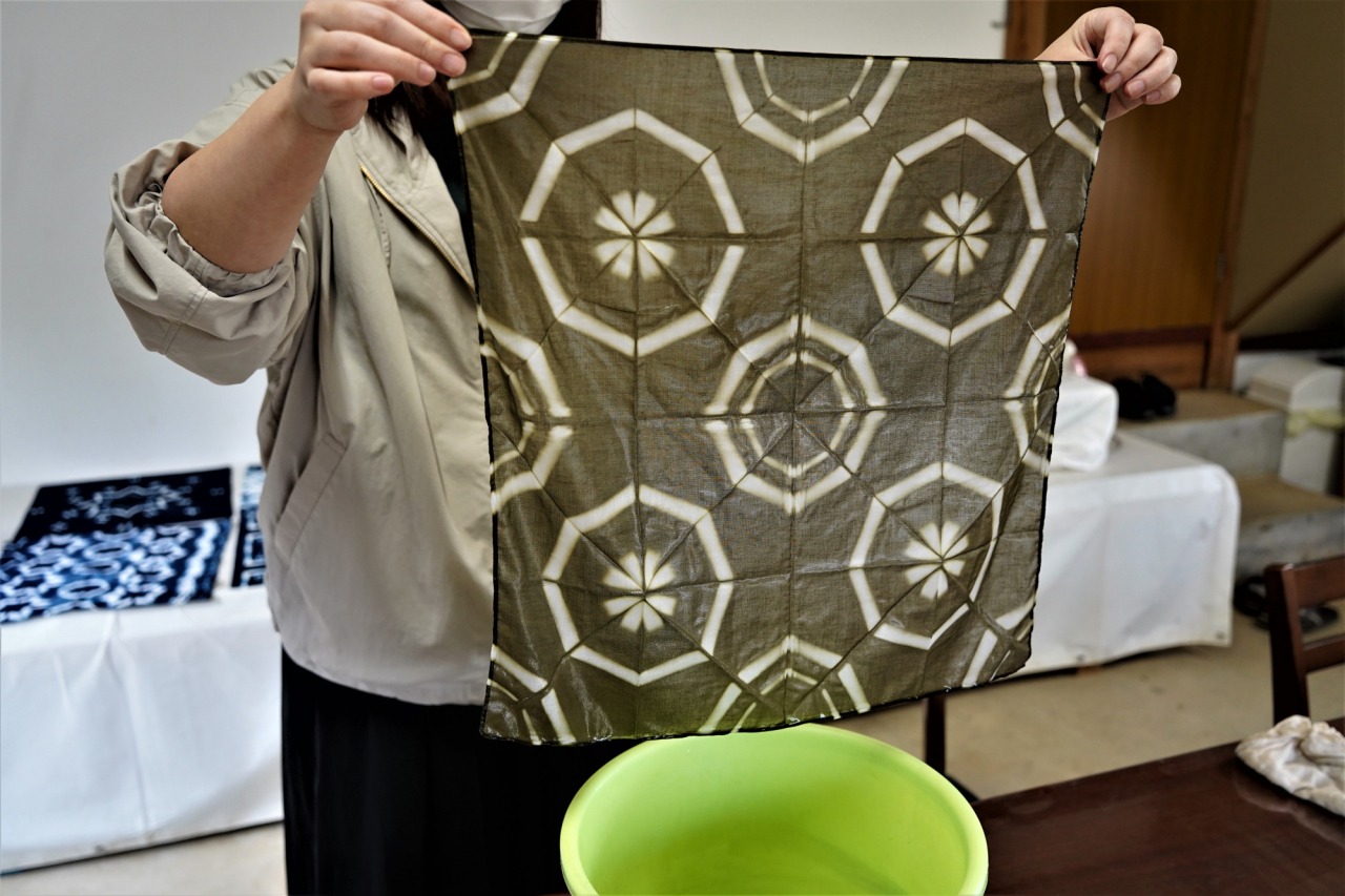 水洗いや染めを繰り返して、色が濃くなったところで、ゴムをほどきます。さて、どんな柄に仕上がっているのか、ちゃんと染まっているのか、ドキドキの瞬間!
