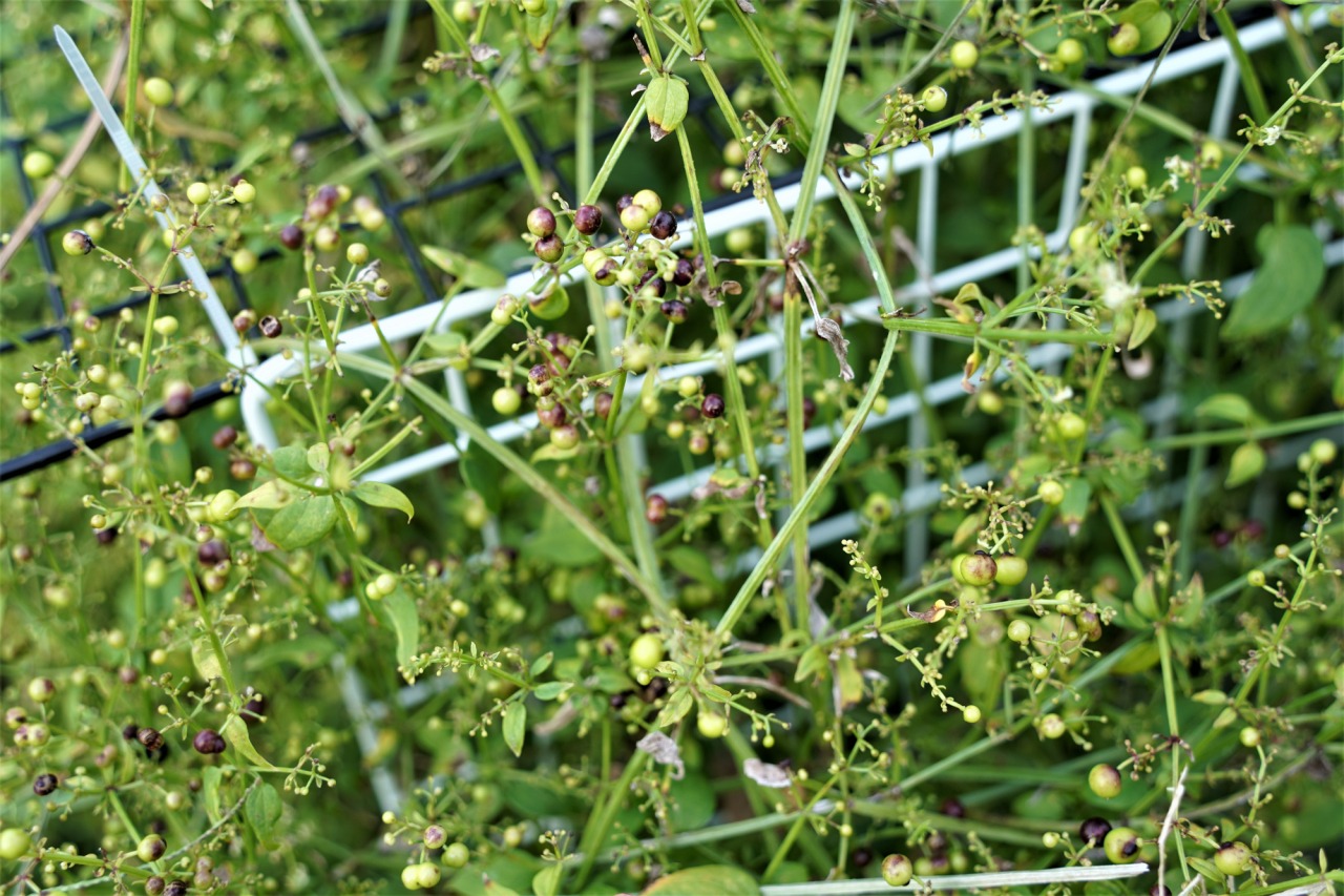 工房の周囲には草木染めに使用する植物が30種類ほど植えられており、希望すれば案内してくれます。写真は日本在来種のニホンアカネで、根を煮出して液をつくります。ほかにも、ヤシャブシ、コガネバナ、アイ、ヤマモモ、シャリンバイなどがあり、さながら植物園のようです。