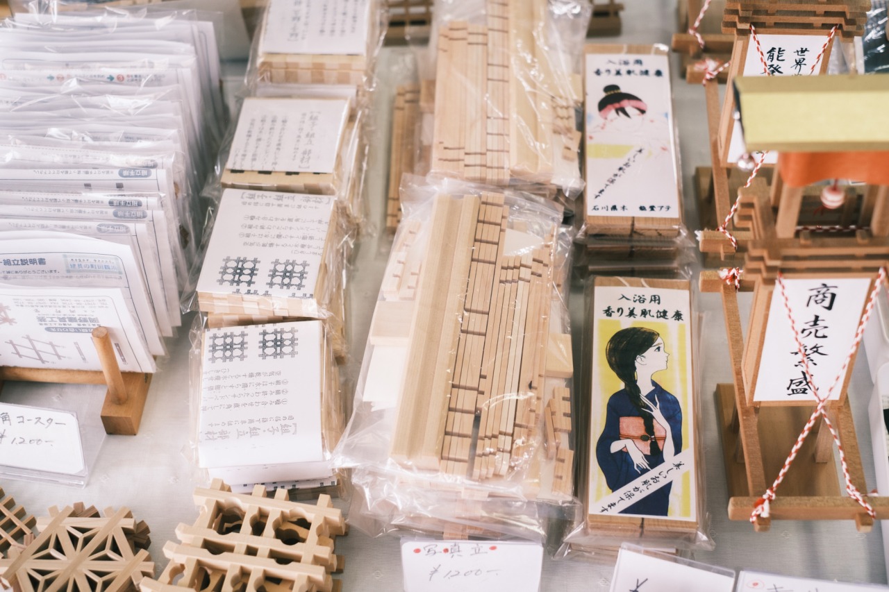 中に入ると、組子で作られた雑貨や工芸品がズラリ。今回の体験ではコースター作りに挑戦します!本日の先生、笑顔の優しい浜本さんが迎え入れてくれました。「4歳の子どもでも作れますか?」と聞くと 「大丈夫ですよ!10分くらいで作れちゃいます!」と浜本さん。 畳敷きの小上がりに案内され、早速体験開始です。