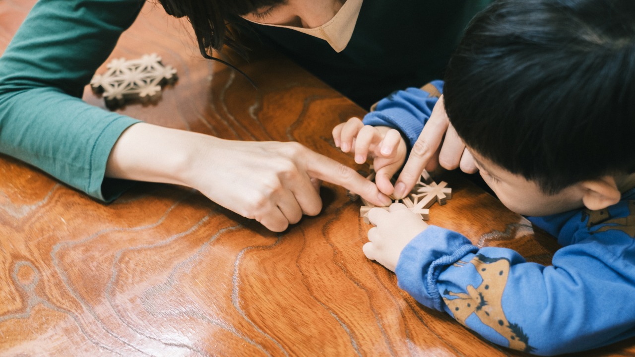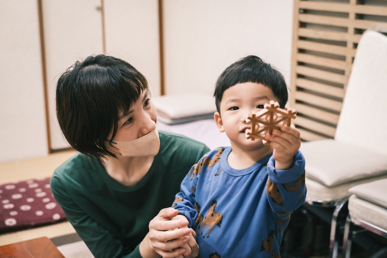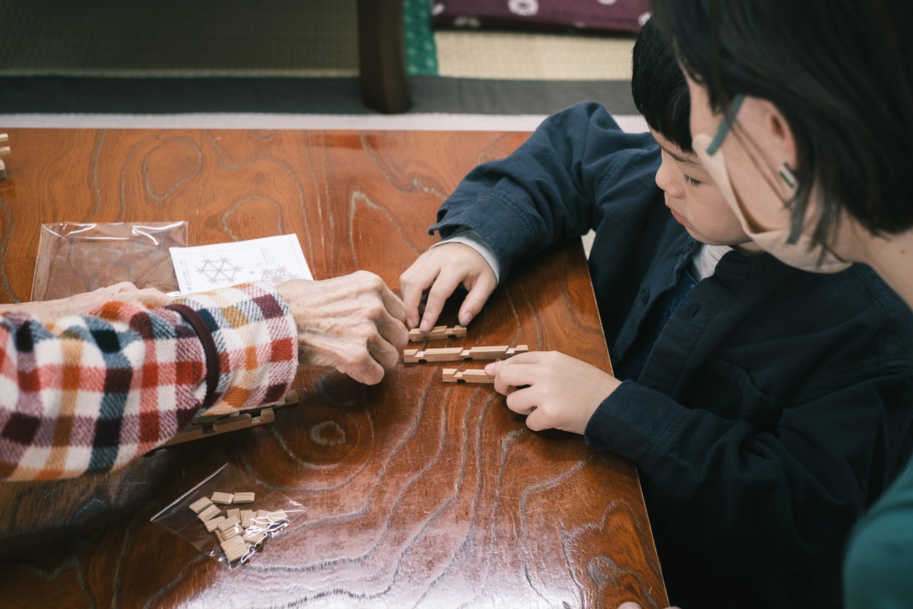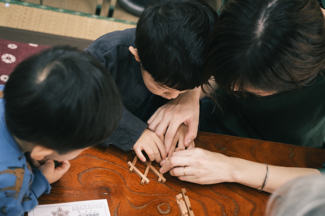 結局、我慢しきれずに次男も挑戦することに。イヤイヤ期の次男ですが、これも組子のチカラなんでしょうか。2歳の子どもでもママと一緒なら、ハイこの通り。サクサク進んであっという間にもうすぐ完成です。