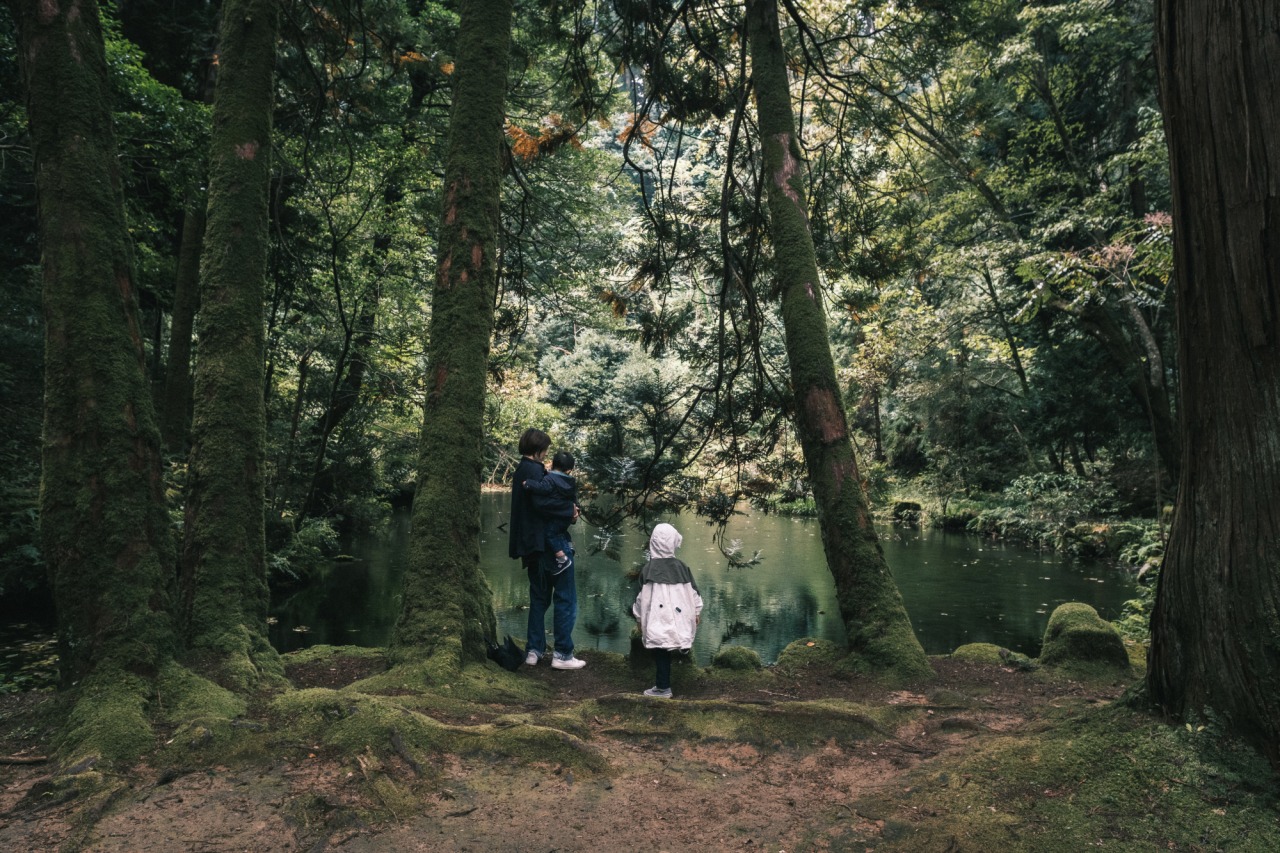 この空間の美しさに見惚れる妻子。ちなみにこの日は少し雨がぱらついてましたが、御手洗池は鬱蒼とした森の中にあるため、木々が天然の傘となりほとんど雨に濡れません。むしろ、雨露で濡れた木々の緑が美しい…。