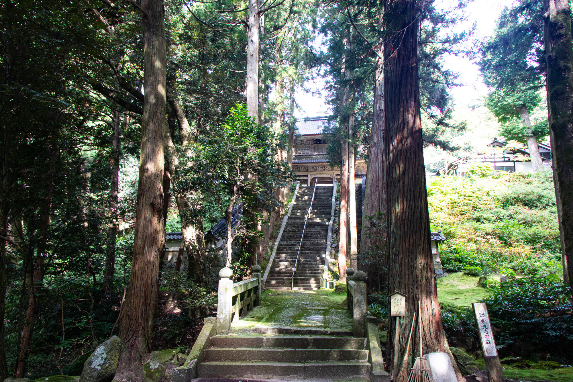 1,294年に日像上人により建立され、桃山時代に加賀国に入った前田利家が寺領を寄進したことを機に、約70年かけて各種建造物が整えられました。境内の建物配置の特徴は、本堂を中央においた3堂横並びの配置にあり、これは古の法華宗寺院の配置を伝える貴重なものです。妙成寺で最も有名なのが北陸唯一の五重塔。実に10棟もの国重要文化財建築が遺されている境内でひときわ目を惹く存在です。妙成寺にれほど立派な建造物が遺された背景には、加賀藩3代藩主前田利常の母である寿福院の存在があります。彼女がここを菩提寺と決め、本堂をはじめとした諸堂の建立に尽力したのです。そして今も寿福院は、妙成寺中興の祖と伝えられています。