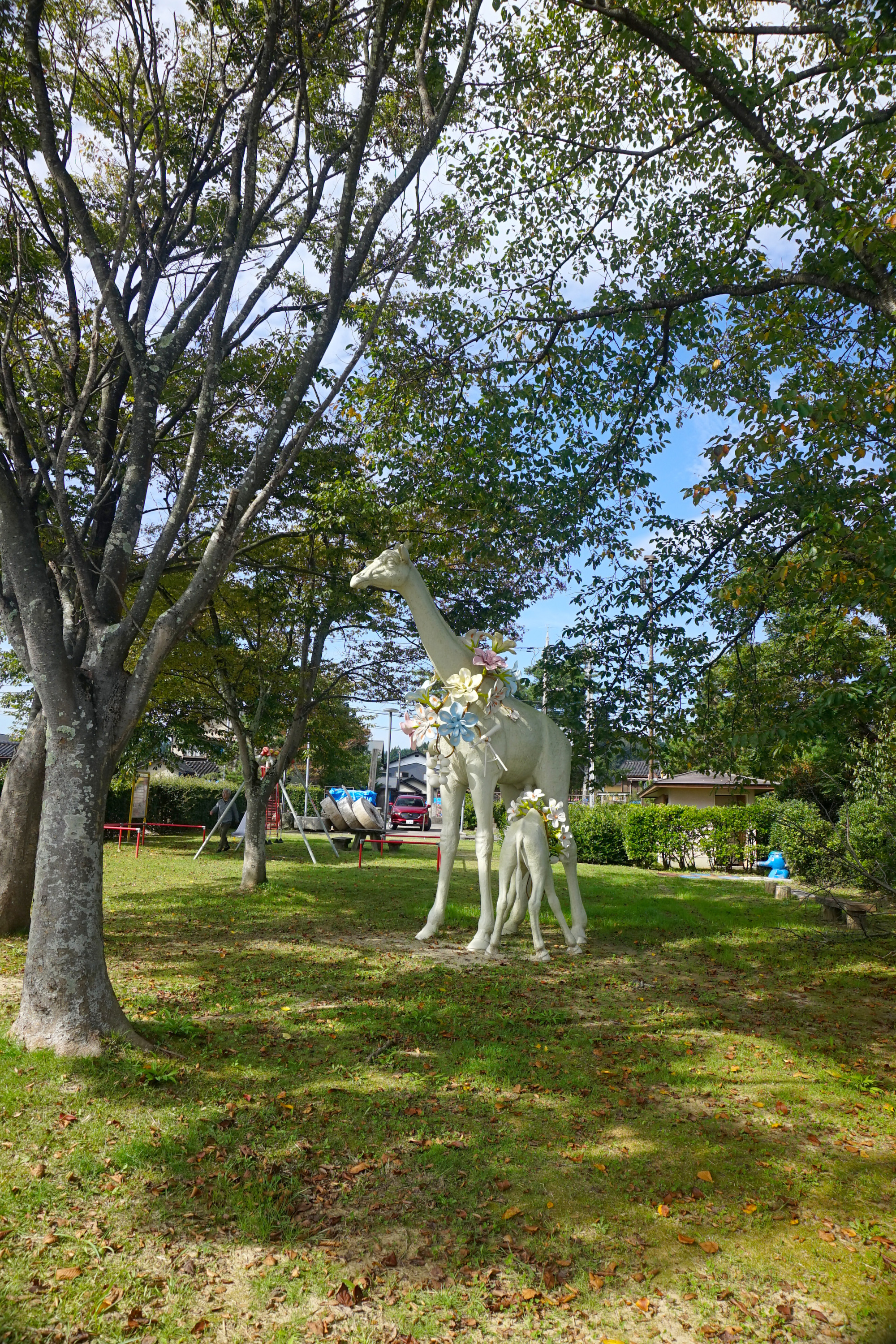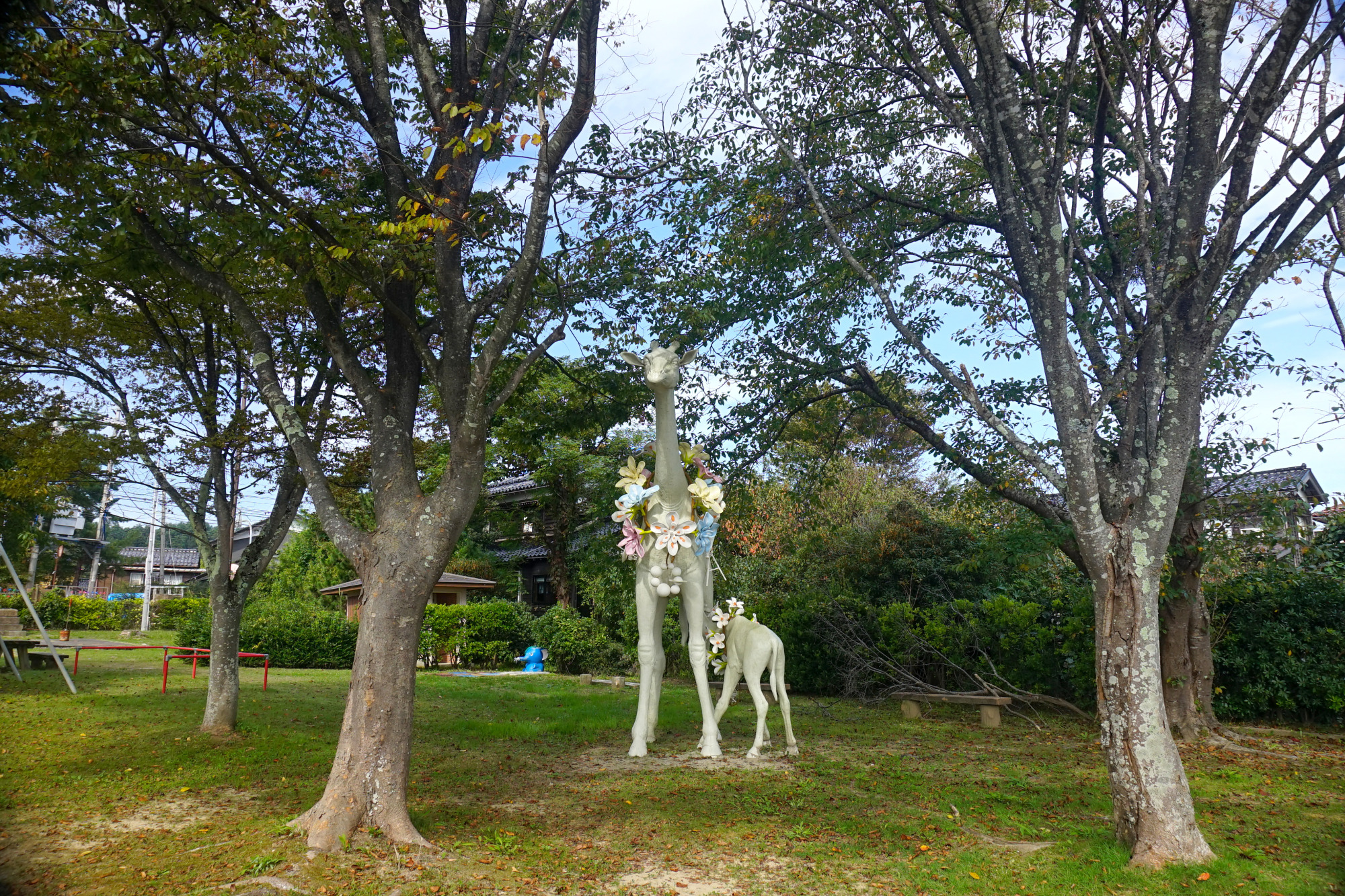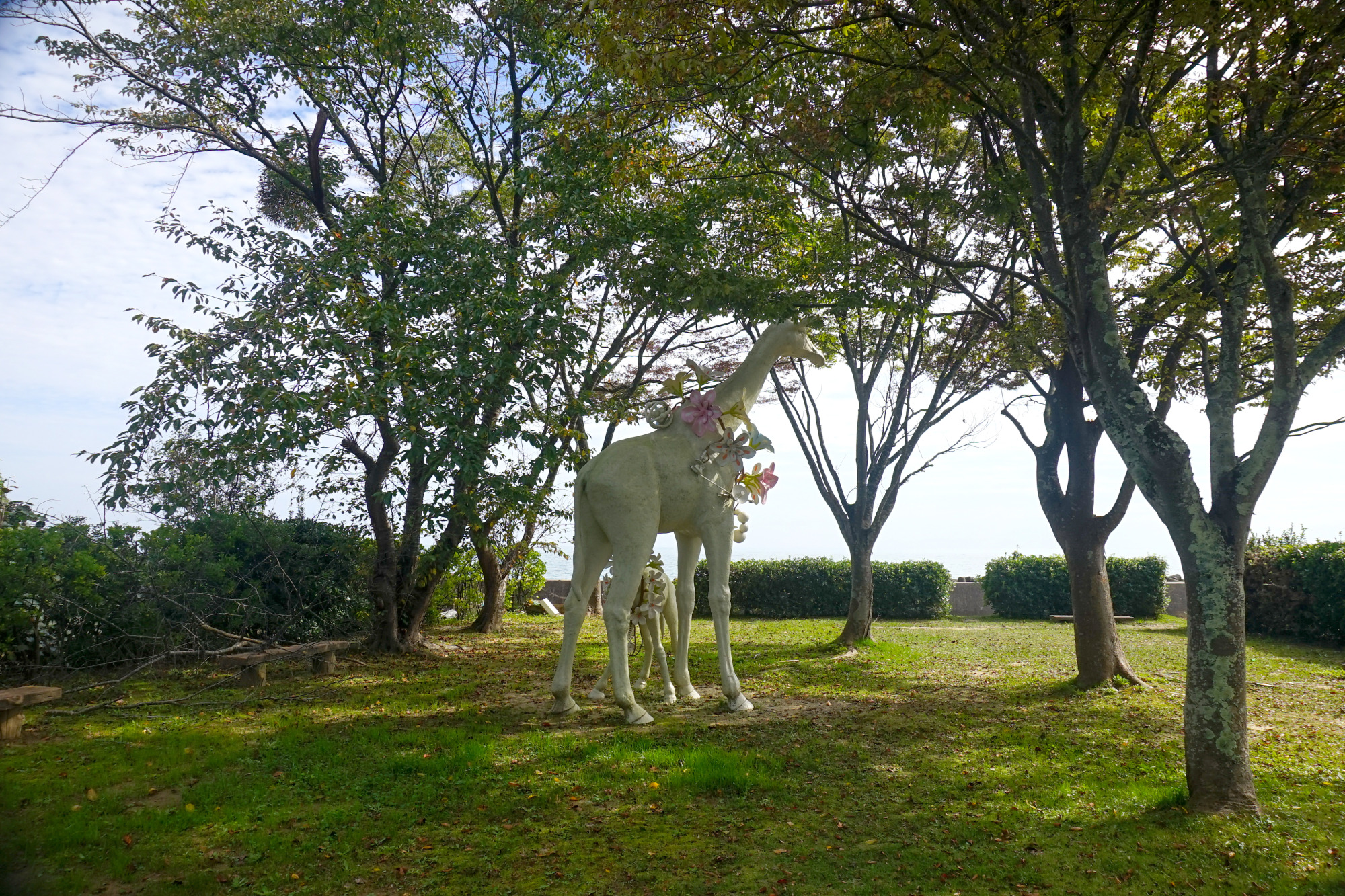 見附島にほど近い、海に寄り添う小さな公園に展示された愛らしい作品です。 故郷や地域性がなくなってきている現代に、「迷子のキリン」の親子を重ねています。海を見つめる母キリンとお乳を吸うのに赤ちゃんキリン。彼らの首には、「答えを探す」ための望遠鏡などが花輪のように取り付けられています。我々に帰る家はあるのだろうか? もしあるとすれば、それはどこなのだろうか?