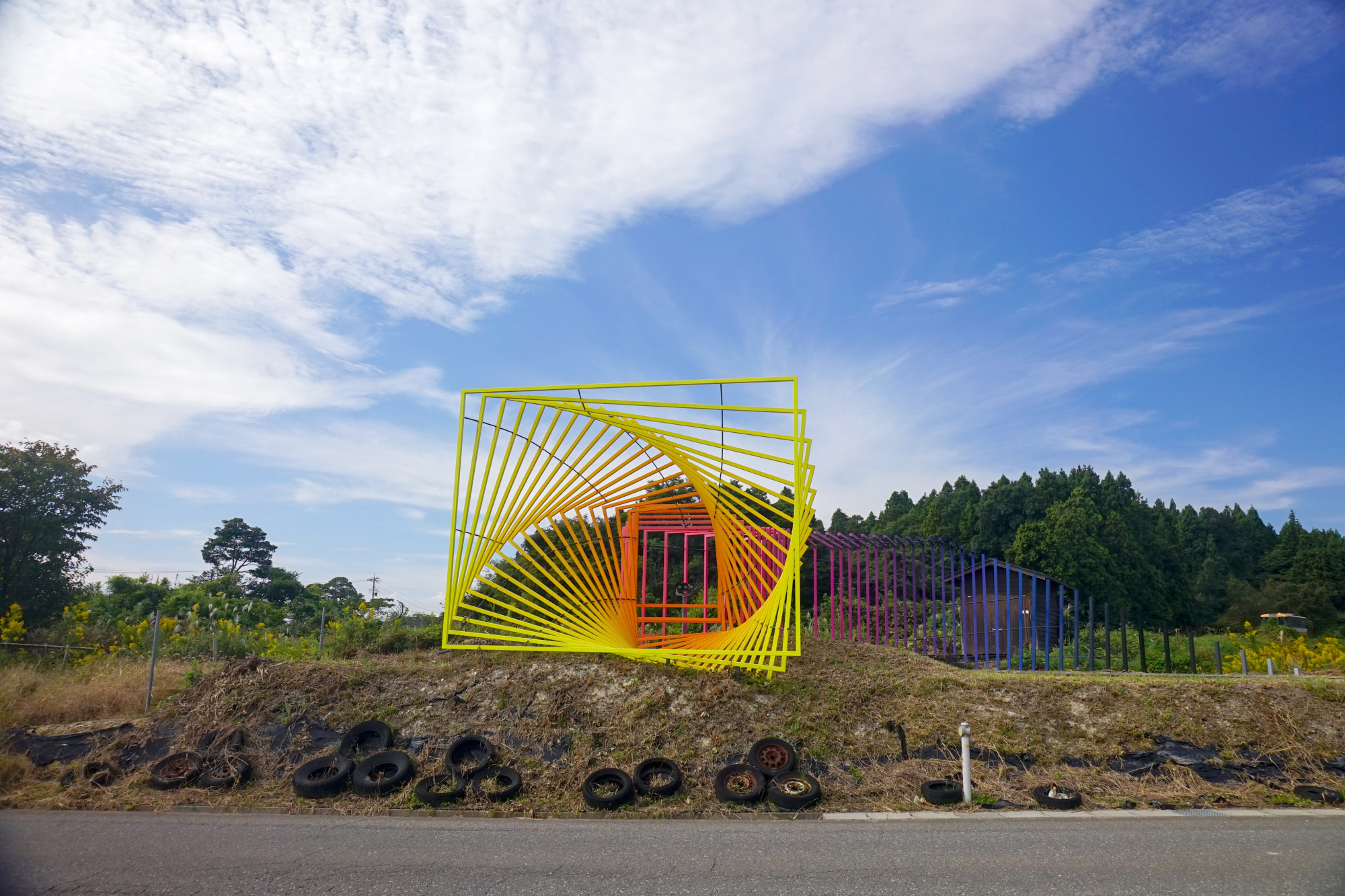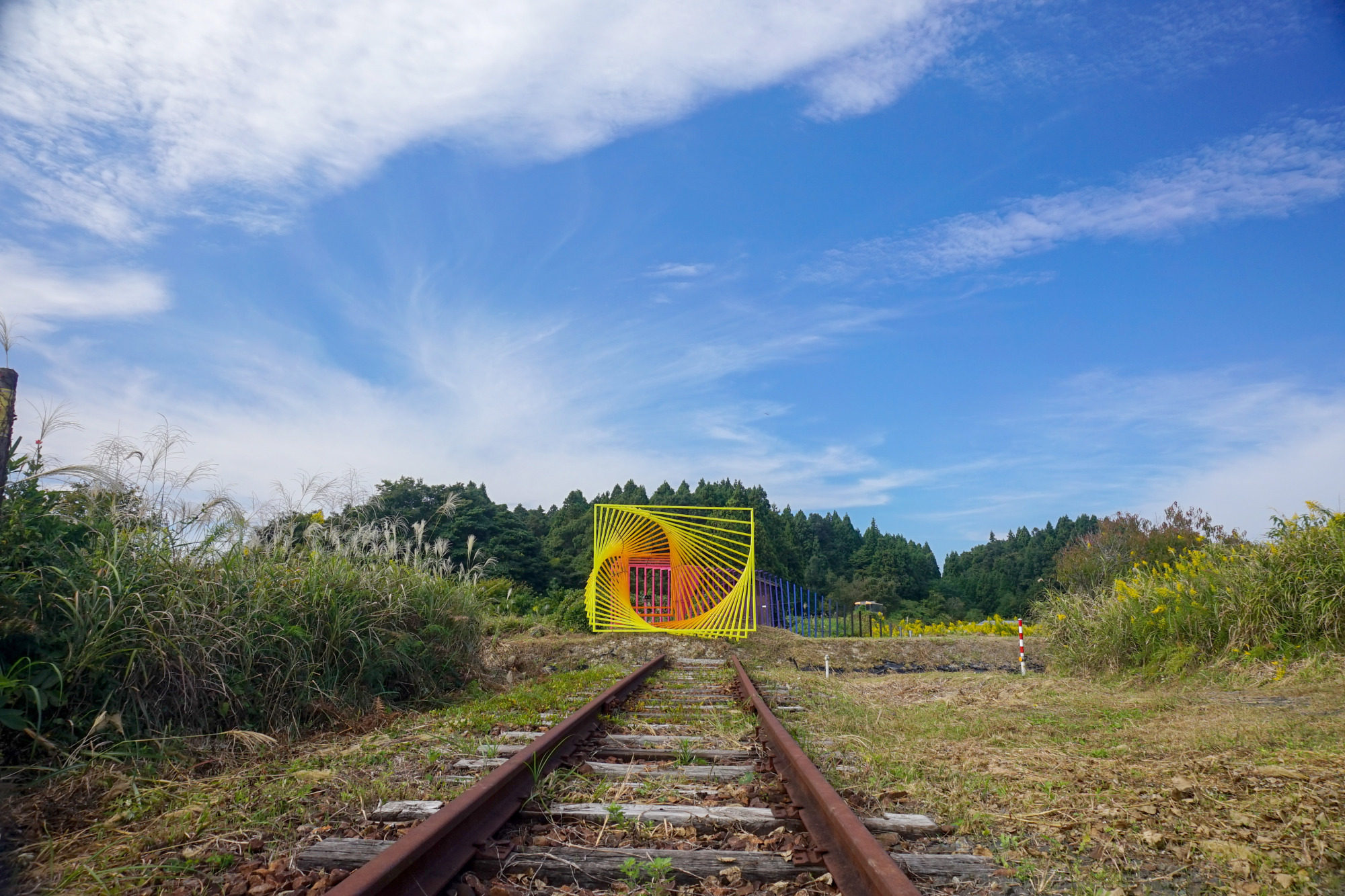 奥能登国際芸術祭を象徴する作品として初年度から設置されている作品です。道路で断ち切られた線路跡で、色を変えながらうねるような空間が創られています。鑑賞者はその空間の中へと進み、行きついたところから双眼鏡を覗くと、のと鉄道の終点だった旧蛸島駅の先に、作家からのメッセージを見ることができます。