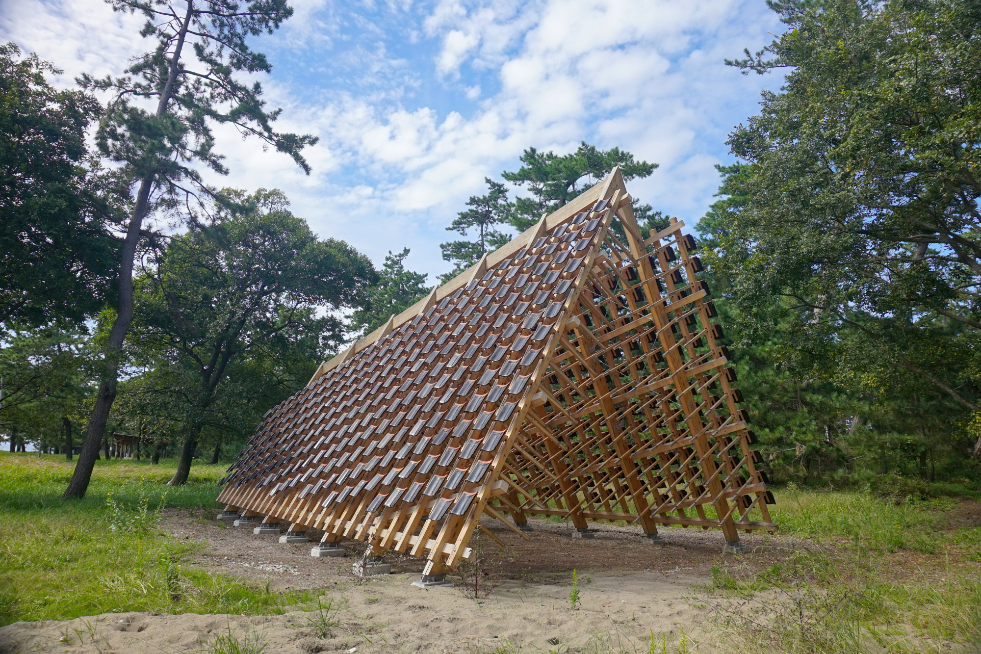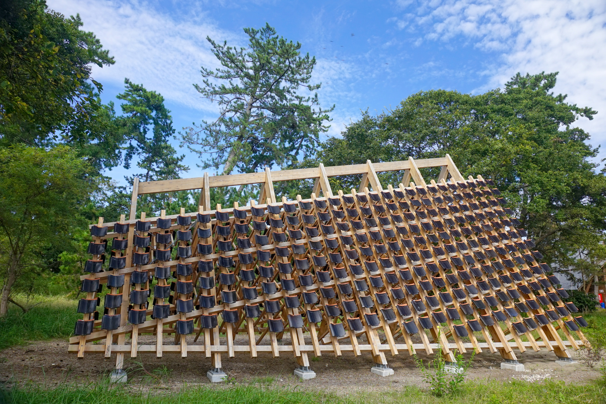 鉢ヶ崎海岸の傍らに設置された作品です。能登の中でもその美しさが際立つ海岸で、瓦を通して、「記憶」、「家」、「人口」、「産業」など、素材と地域問題の関連性をとりあげています。作家は、家というものを記憶を集めるエネルギーの象徴と考え、「集まることは力になる」をコンセ プトに、昔の記憶を掘り起こしていく。この地を離れた人々が、ふたたび戻ってくるようにという願いが込められた作品です。