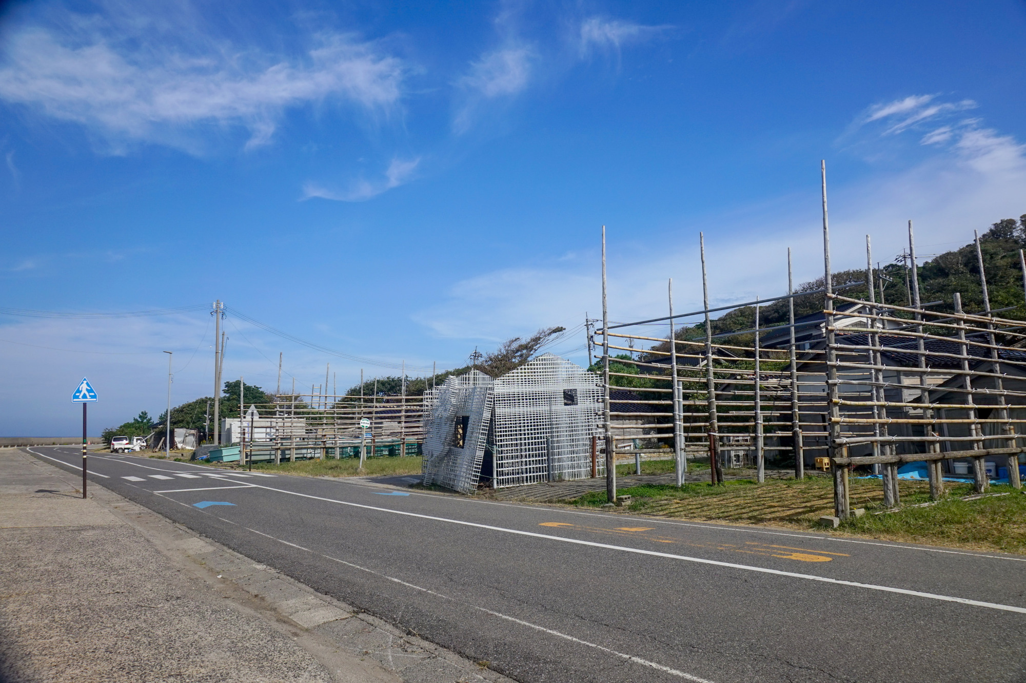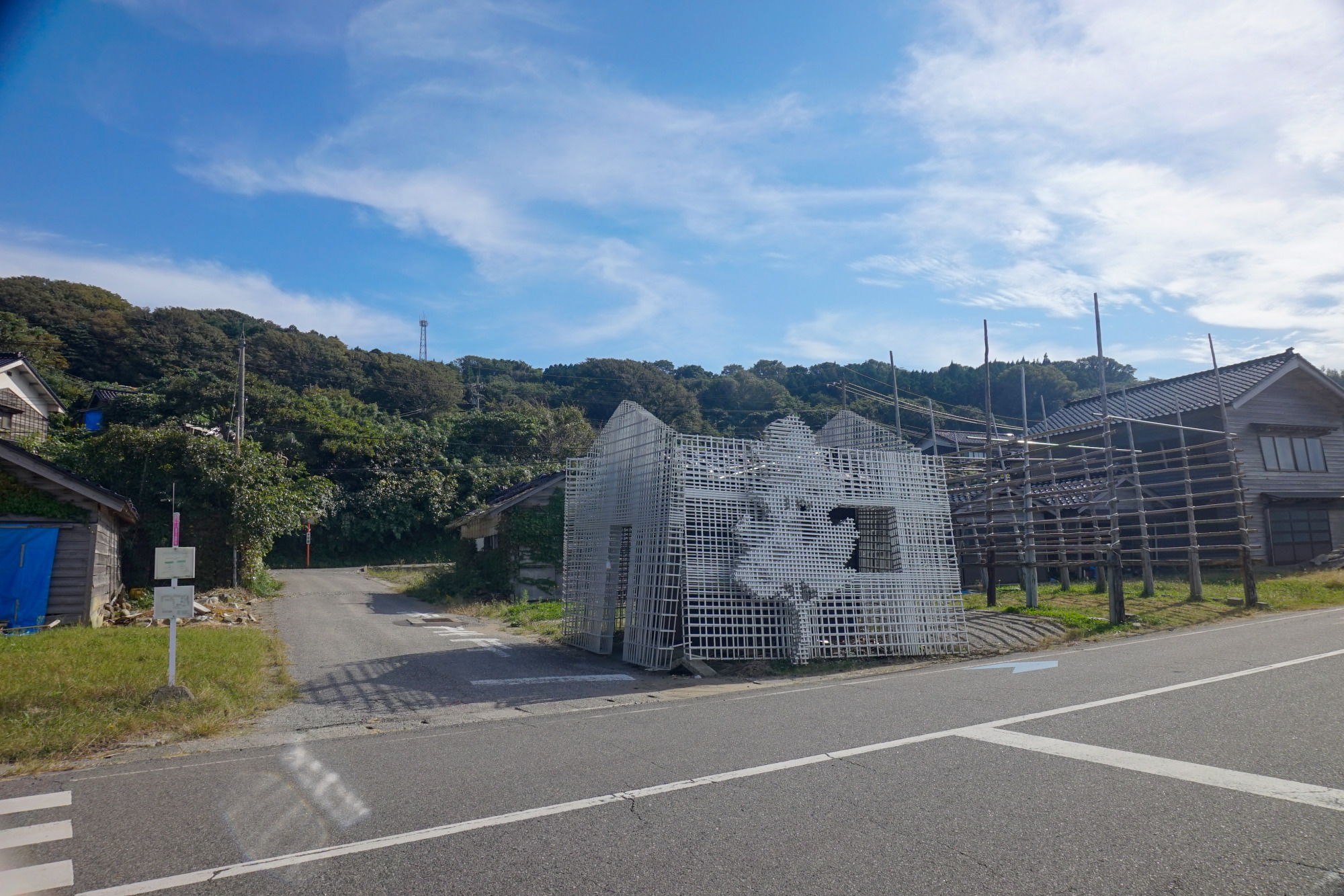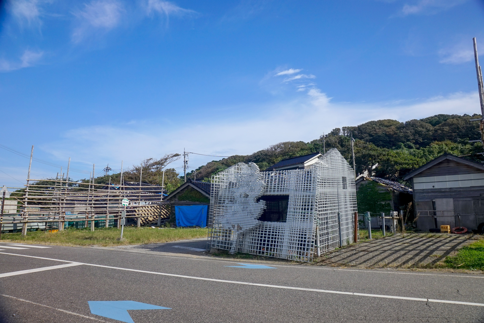 折戸町の能登洲崎バス停が作品となっています。はざ干しのはざに囲まれ、目の前には小さな漁港が佇んむ中、珠洲の風景の特徴のひとつである屋根つきのバス停が現代アートとして溶け込んでいます。数学者でもある作家は、バス停を垂直平行を基本構造とするアルミニウムのパイプで包みこみ、作品化しています。当初は市内4箇所のバス停が作品化されていましたが、震災によりいまはこのバス停だけが作品としてその姿を留めています。