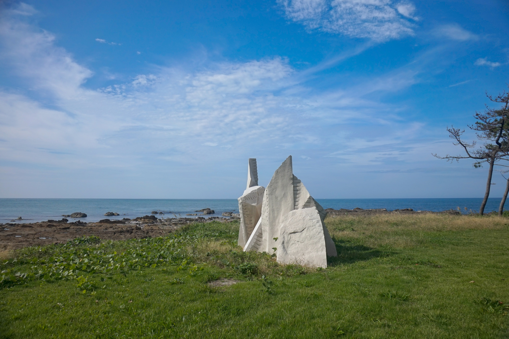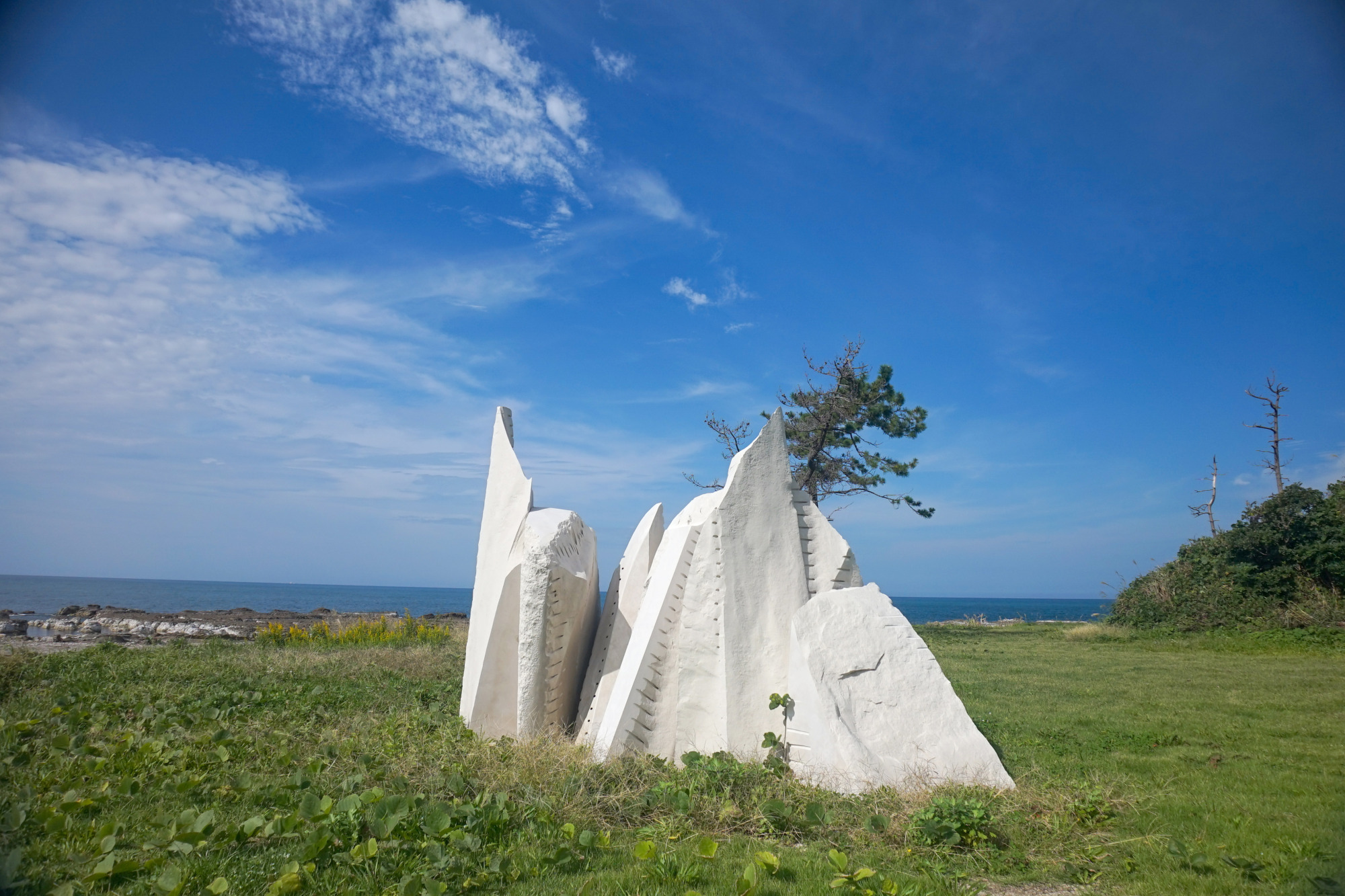 鰐崎海岸に設置された奥村浩之氏の石彫作品です。白く輝く石素材の持つテクスチャー、うねりが表現されたカタチが、鰐崎海岸の目の前に広がる海の青さに囲まれて存在感を放っています。時間や日によって異なる色味、場所によって異なる触感が、時には優しく、時には荒々しい、珠洲の波や風を感じさせてくれます。 本当に美しい鰐崎海岸の自然風景に、見事に色を添えて記憶に残してくれるのが『風と波』です。