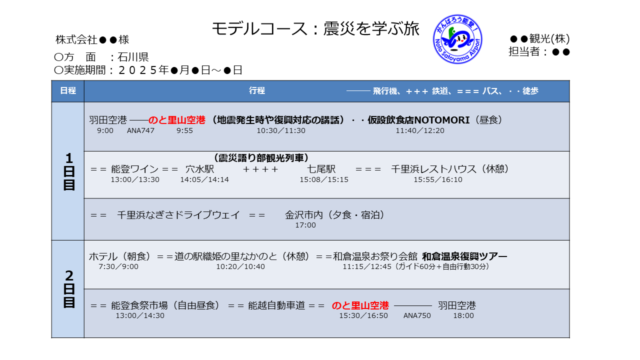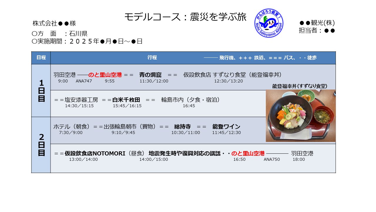 ※現在、受入体制を超える多数のお問い合わせをいただいており、当面はのと里山空港の航空便を利用する団体に限定して受入いたします。お近くからの団体でも、能登視察と併せて羽田便で東京へ向かう視察団体などでしたら受入可能です。