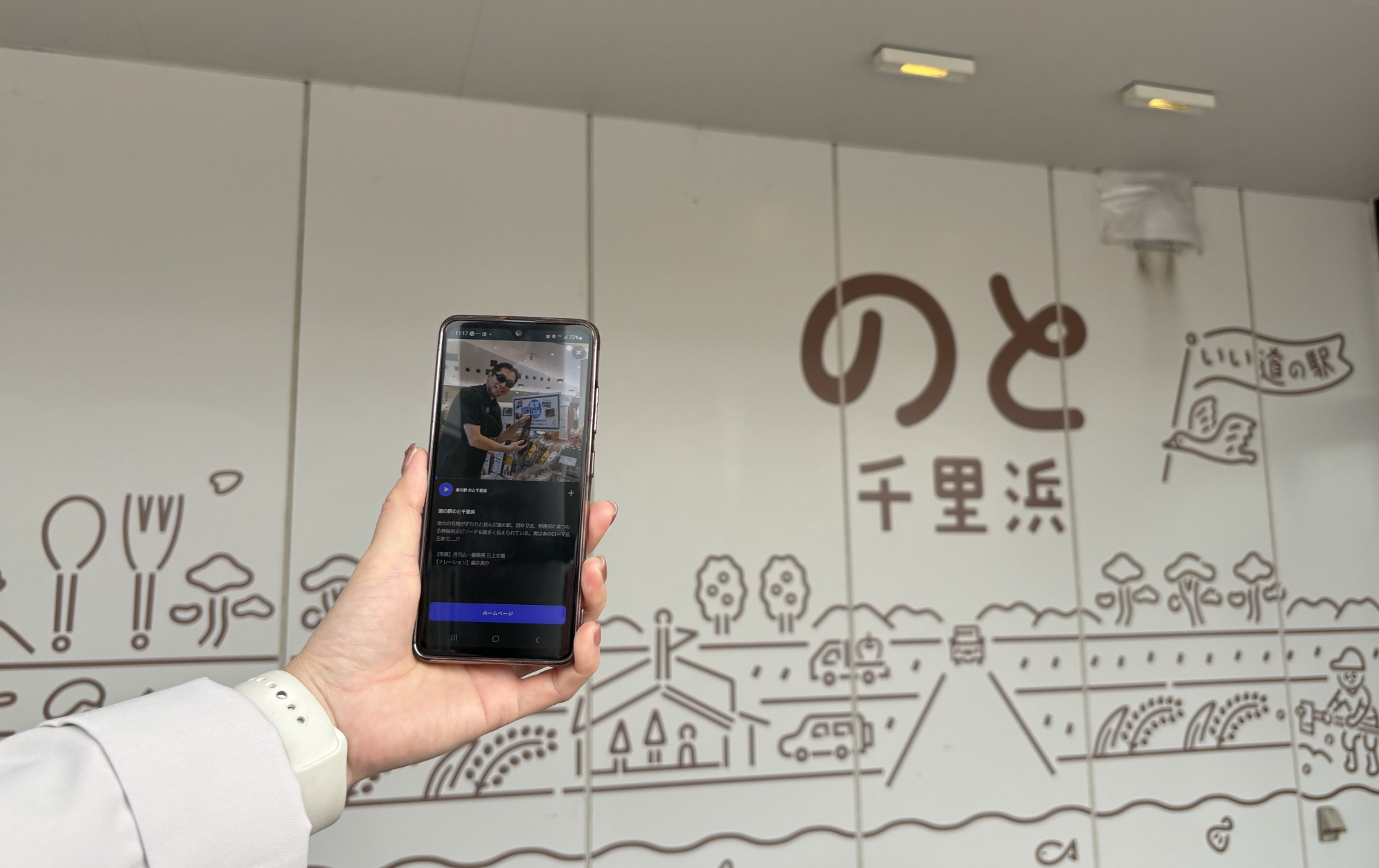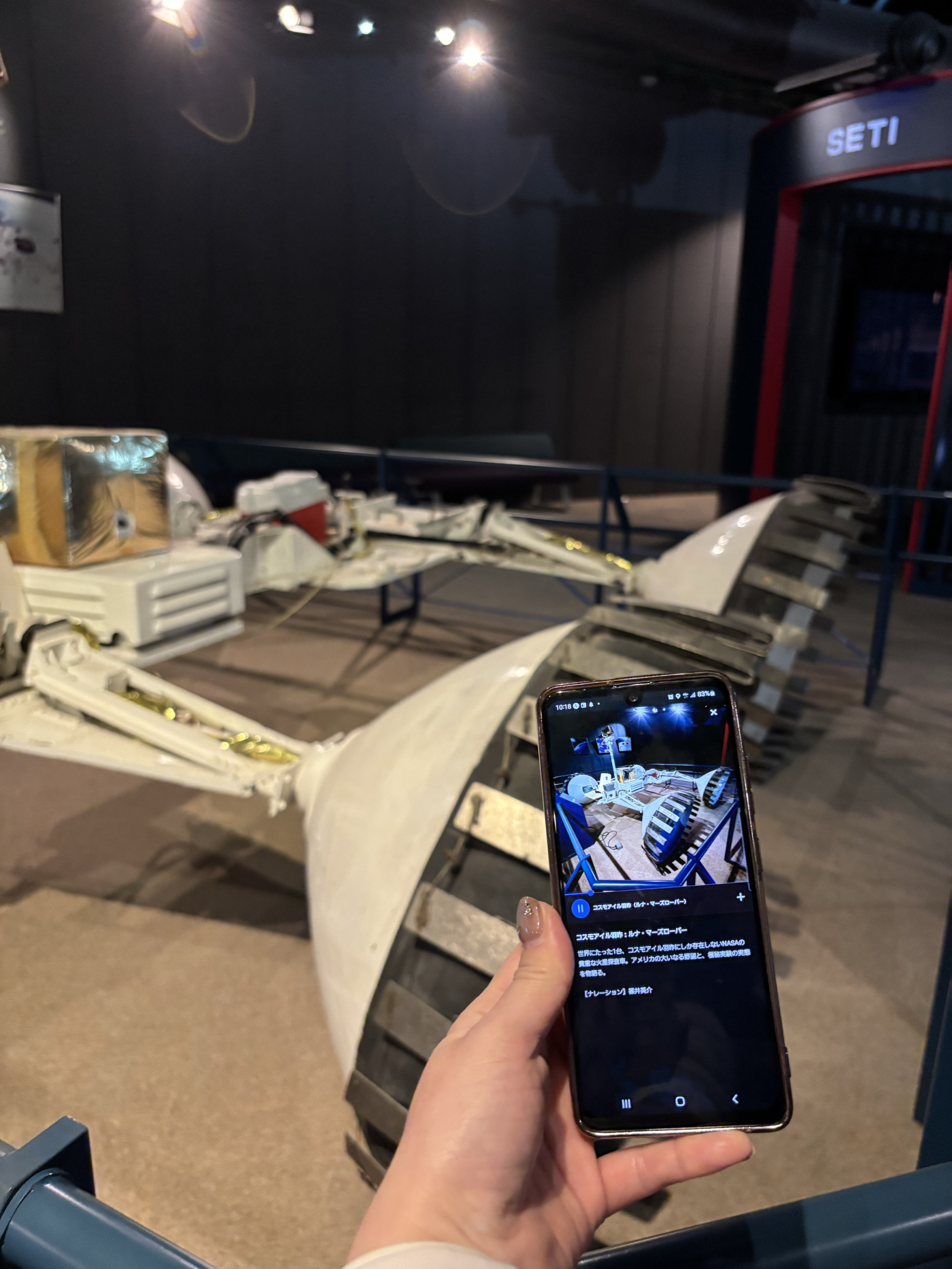 コスモアイル羽咋に入館後、アプリをインストール。 コスモアイル羽咋内の解説スポットは全10か所!スマートフォン片手に展示へ向かいます。