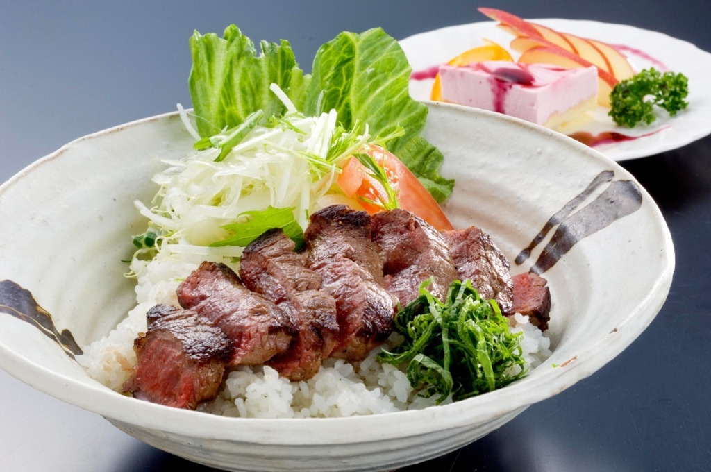シェフ自慢の能登牛ステーキがのった贅沢な丼。肉の旨味が口いっぱいに広がる至高の一品です。