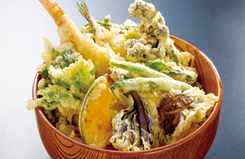 その時期に採れる旬の魚や野菜、山菜を天ぷらにして豪快に盛り付けた丼。コンパク丼(1,700円)や能登牡蠣天ぷら丼(1,800円、12~4月)もあります!