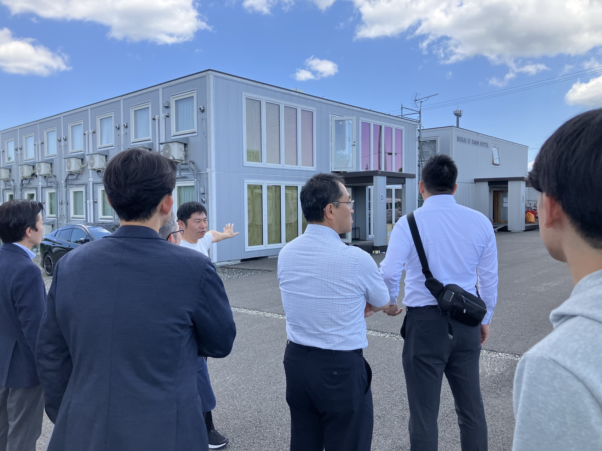 前田専務の説明の後、のと里山空港敷地内に建てられた仮設宿泊所を見学しました。仮設宿泊所では「加賀屋」で勤務されていた経験のある職員が、施設管理や予約受付で活躍しています。震災から約1年半が経った現在でも、他県から派遣されている行政職員を中心にほとんど予約が埋まっているそうです。