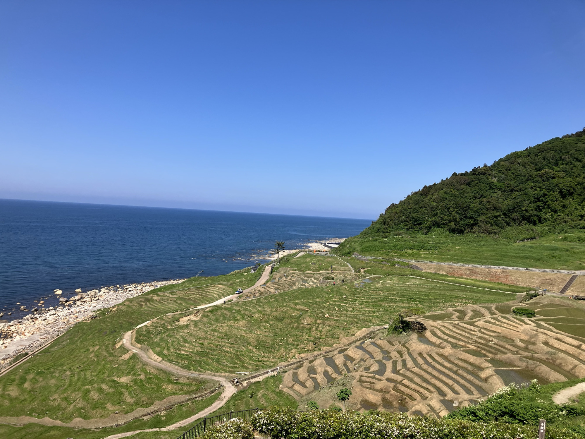 貸切バスで白米千枚田に移動し、世界農業遺産「能登の里山里海」を代表する景観の棚田を見学しました。この日はよく晴れて、青い空と海の素晴らしい景色を見ることができ、絵葉書のような素敵な写真が撮れました。また、以前と比べると海底が隆起して白くなっているのがわかります。(左または上が現在のもの)