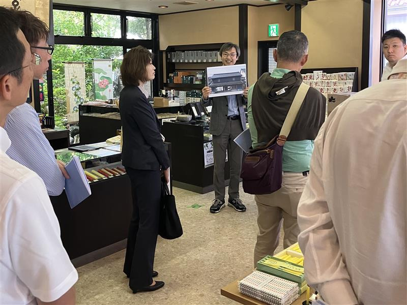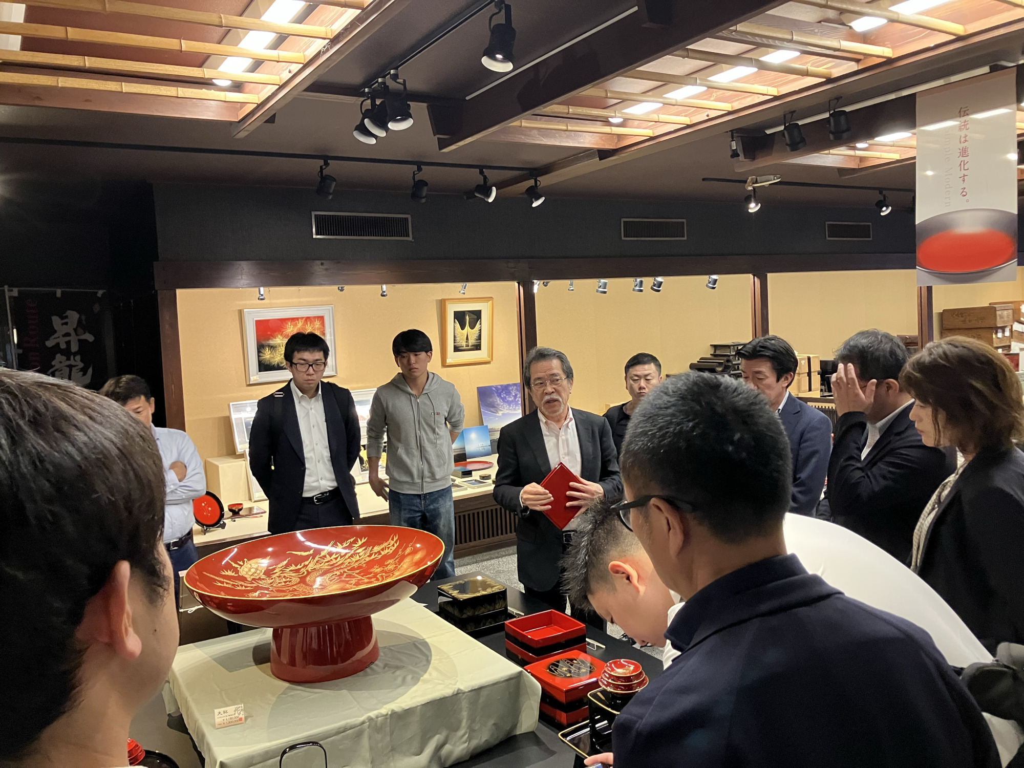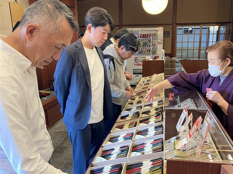 塩安漆器工房では多くの団体旅行を受け入れています。今回も輪島塗の工程を見学させてもらいました。店主の塩安さんに工房を案内していただき「輪島塗は布を巻いたり漆を塗り重ねてとても丈夫なのが特徴」と説明を受け、お買い物でも目利きして選んでいました。